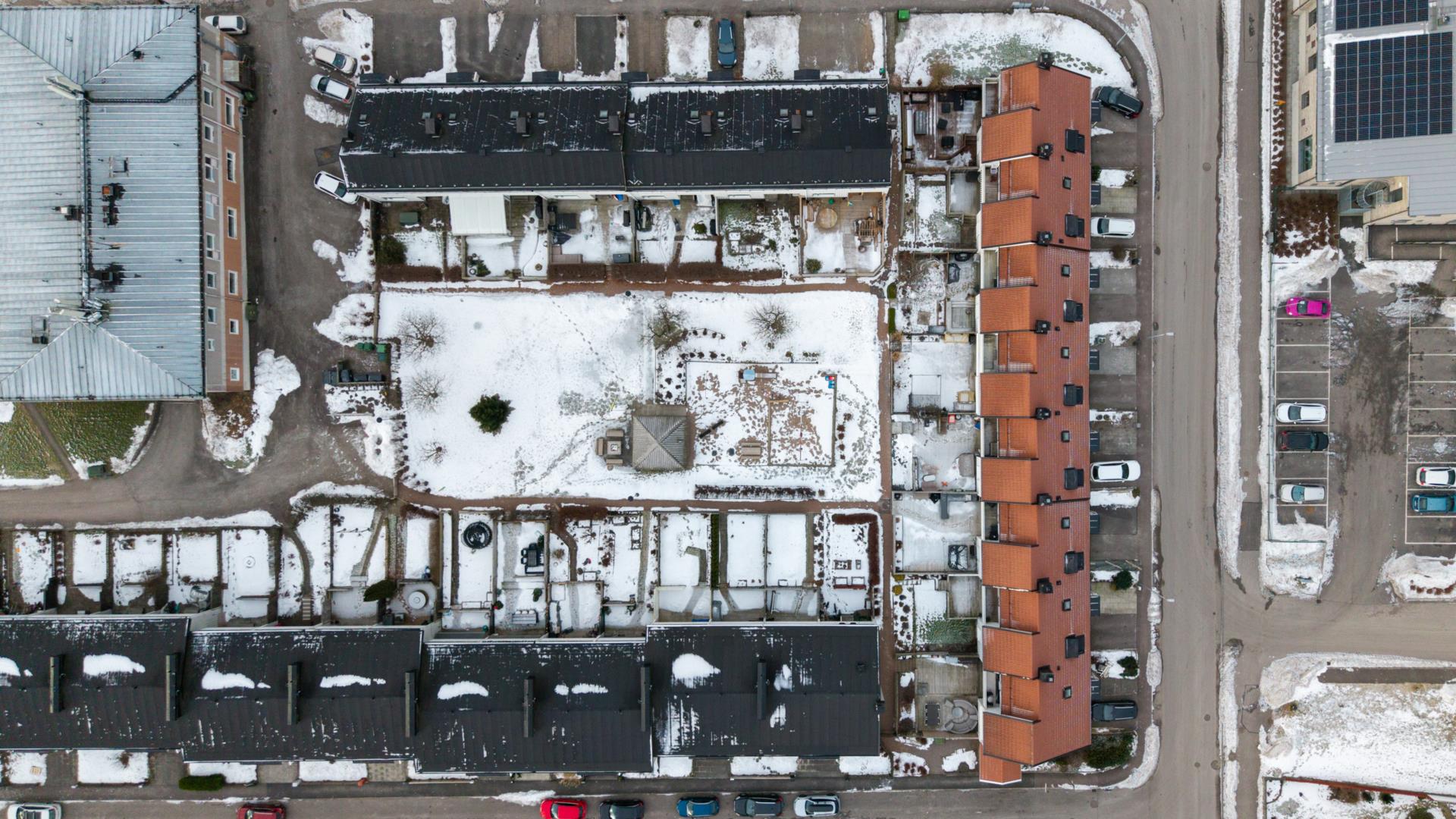 Snöskottning sköter var och en på sin bit av trottoaren. Läs även i skötselanvisningarna under fliken Snöskottning vem som ansvarar för snöskottning på gemensamma ytor.