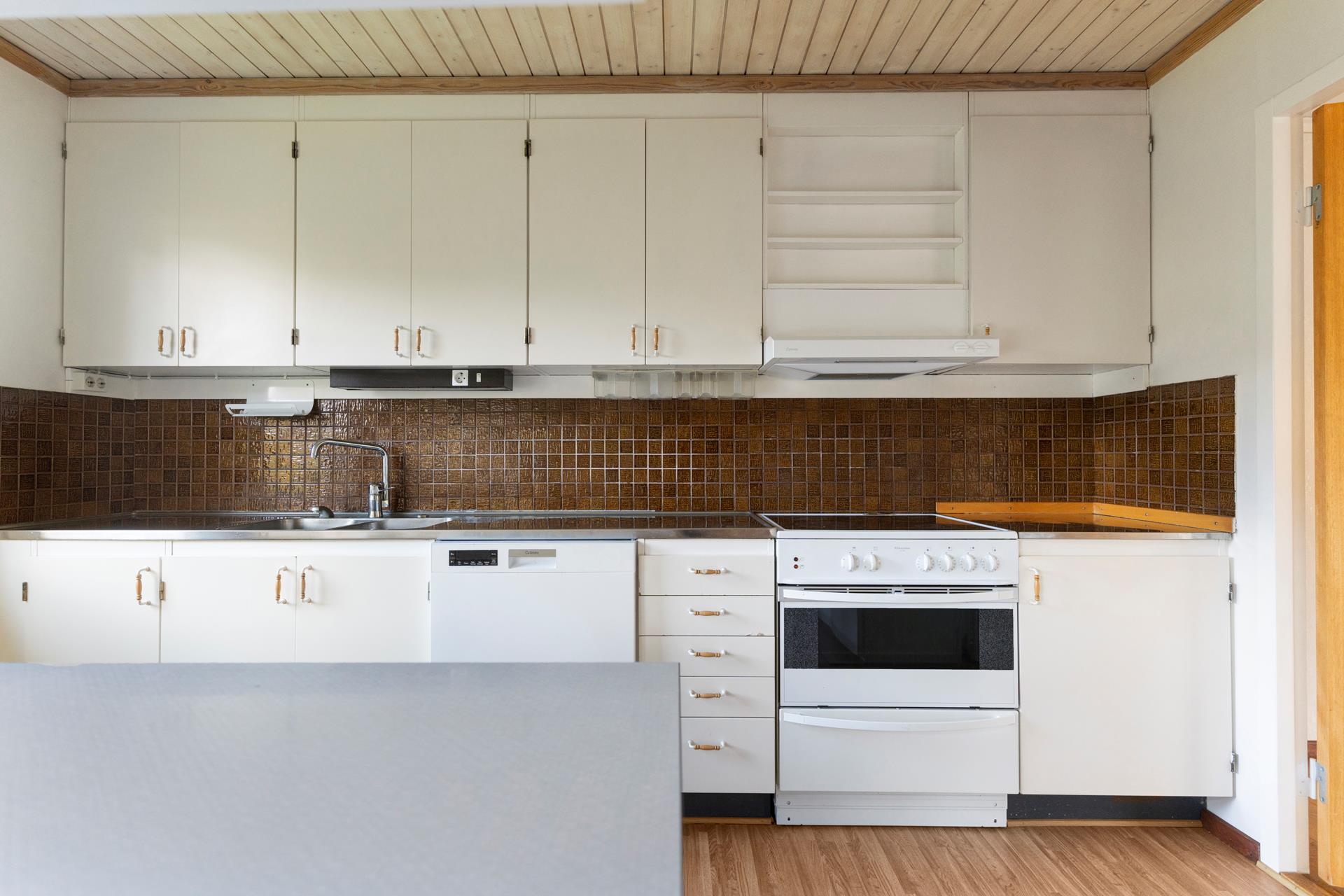 KÖK med laminatgolv och mycket plats för matbord. Här finns även kyl/frys, spis, ugn, fläkt samt diskmaskin. Rymligt FÖRRÅD intill och utgång till baksidan av huset.