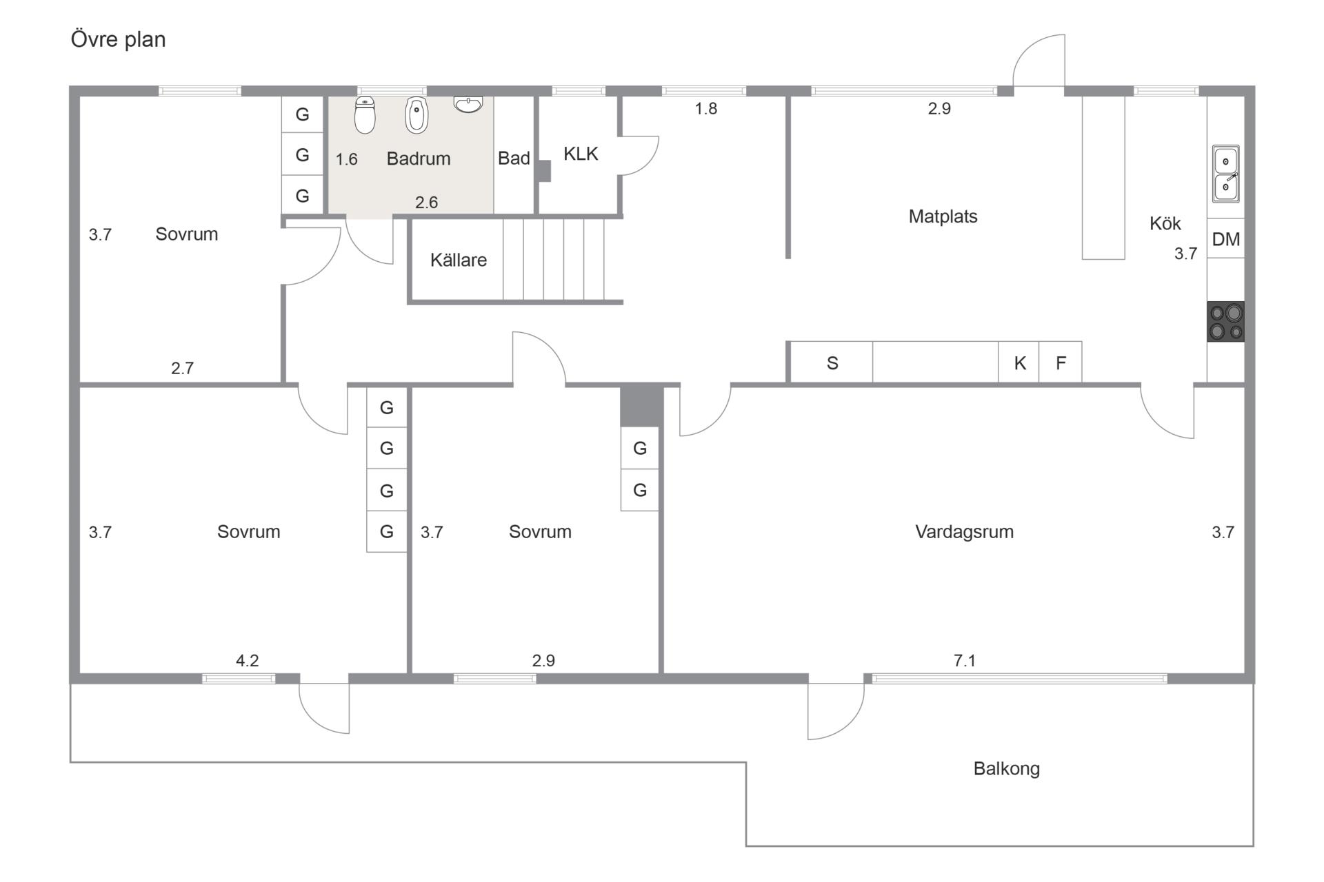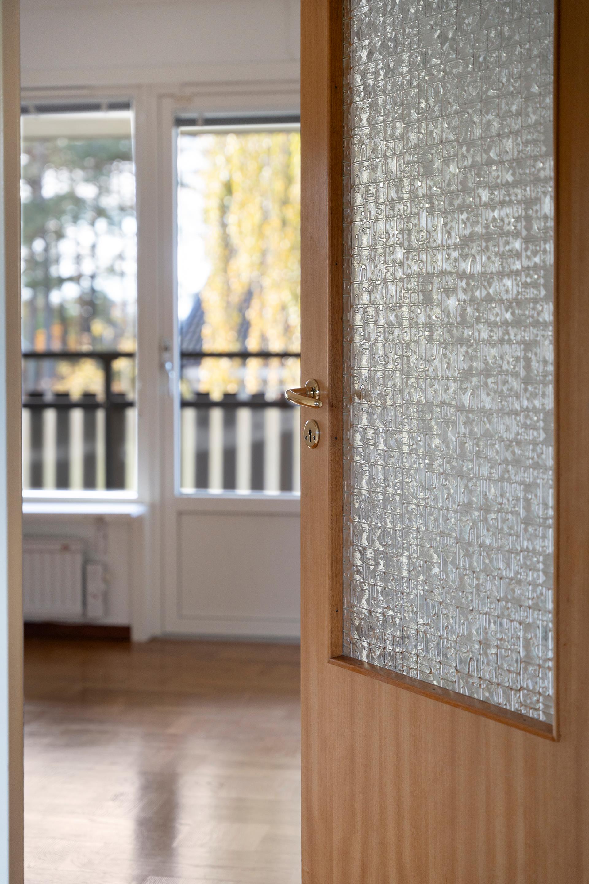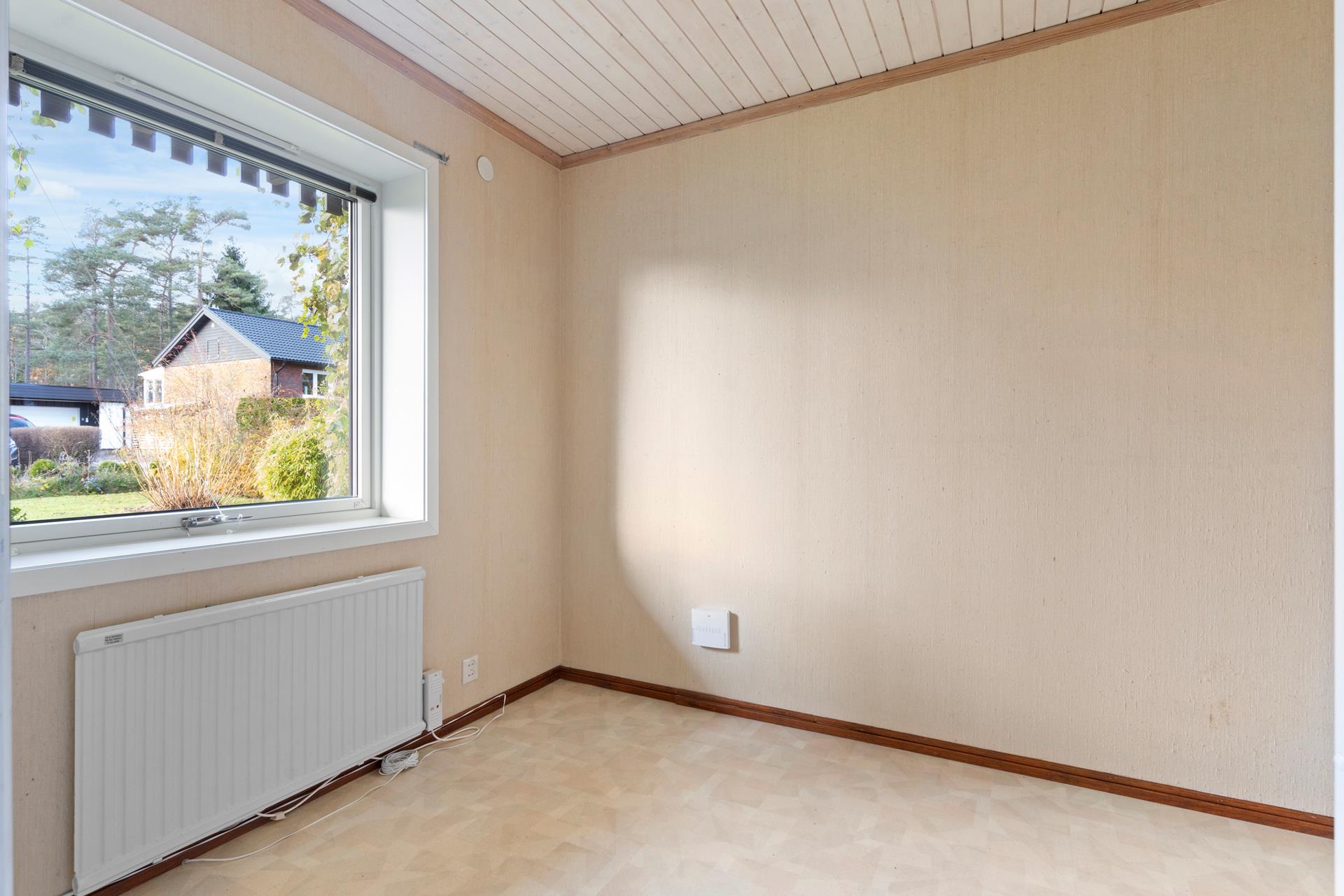 SOVRUM med plastmatta och platsbyggda garderober samt utgång till balkongen.