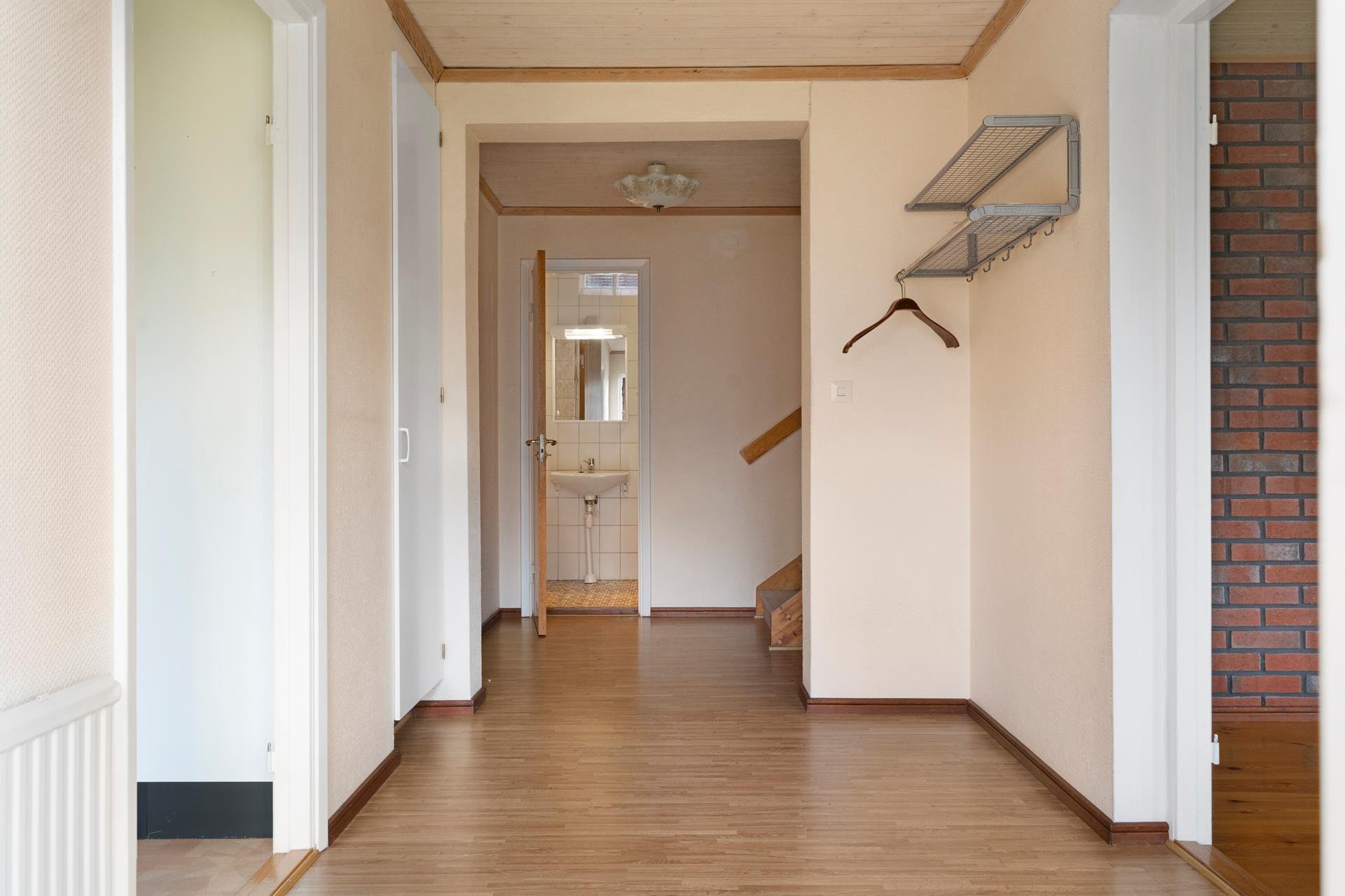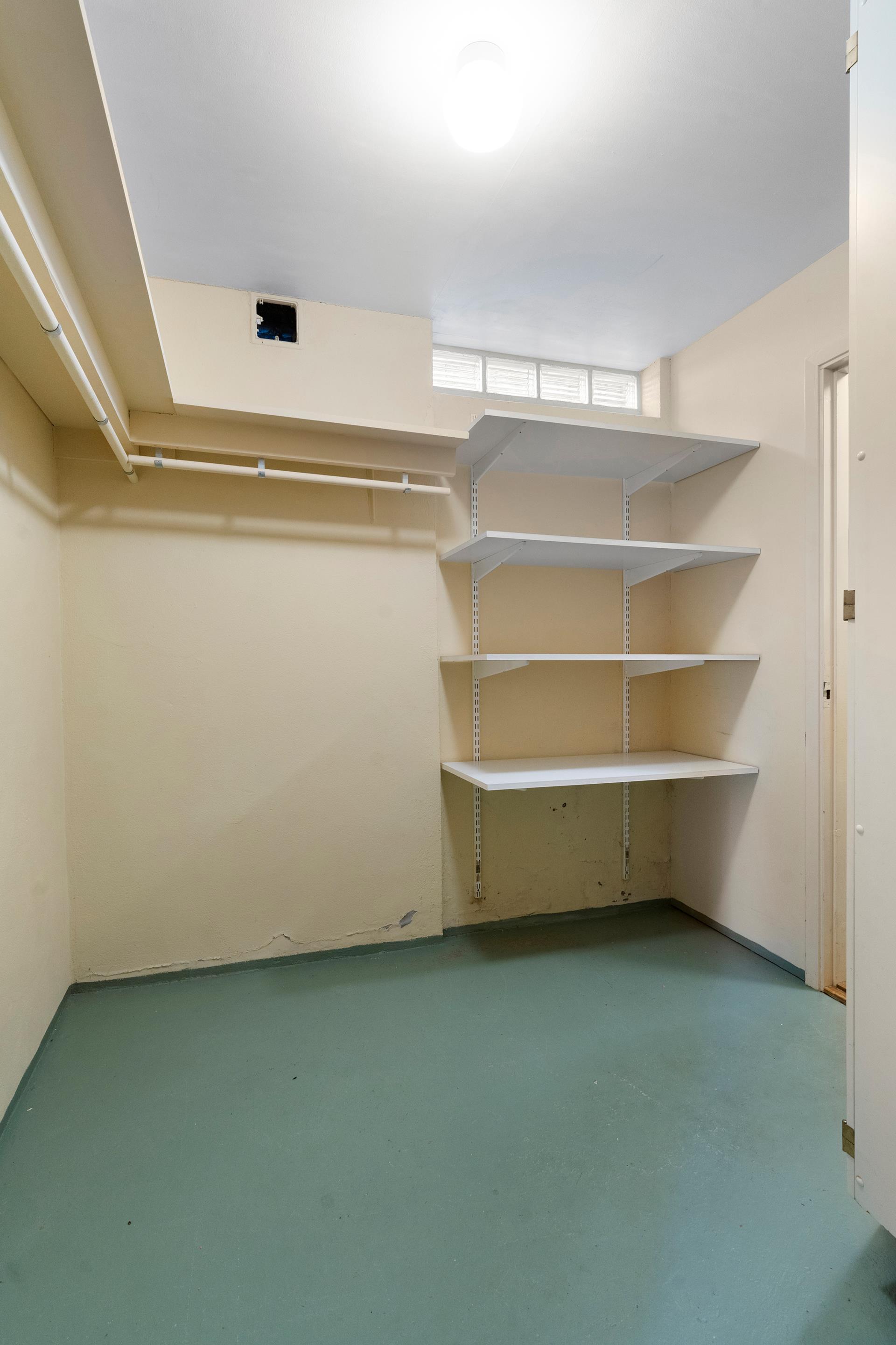 HALL med laminatgolv, tapet på vägg och förvaring i form av garderober samt matkällare/skafferi..