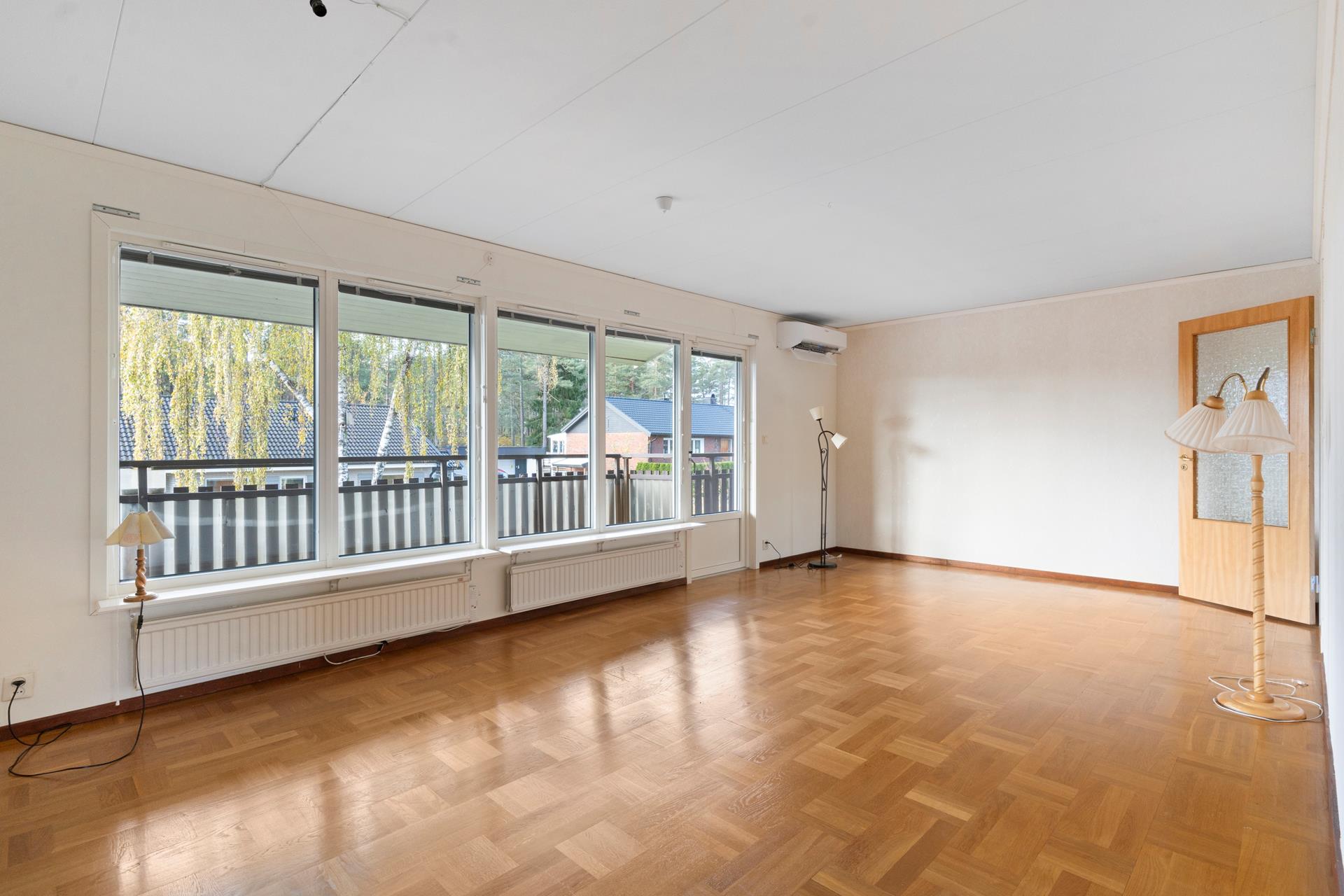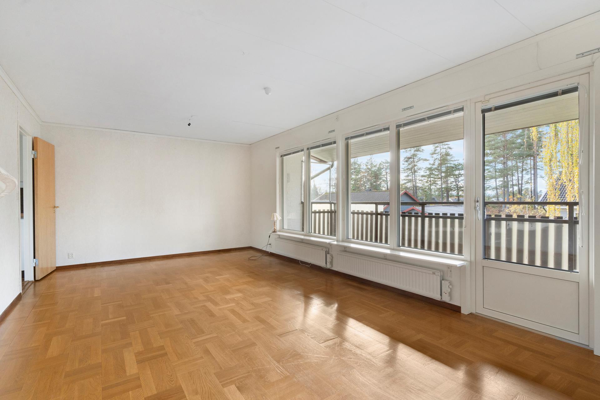 VARDAGSRUM med parkettgolv och stora fönsterpartier. Utgång till balkong.