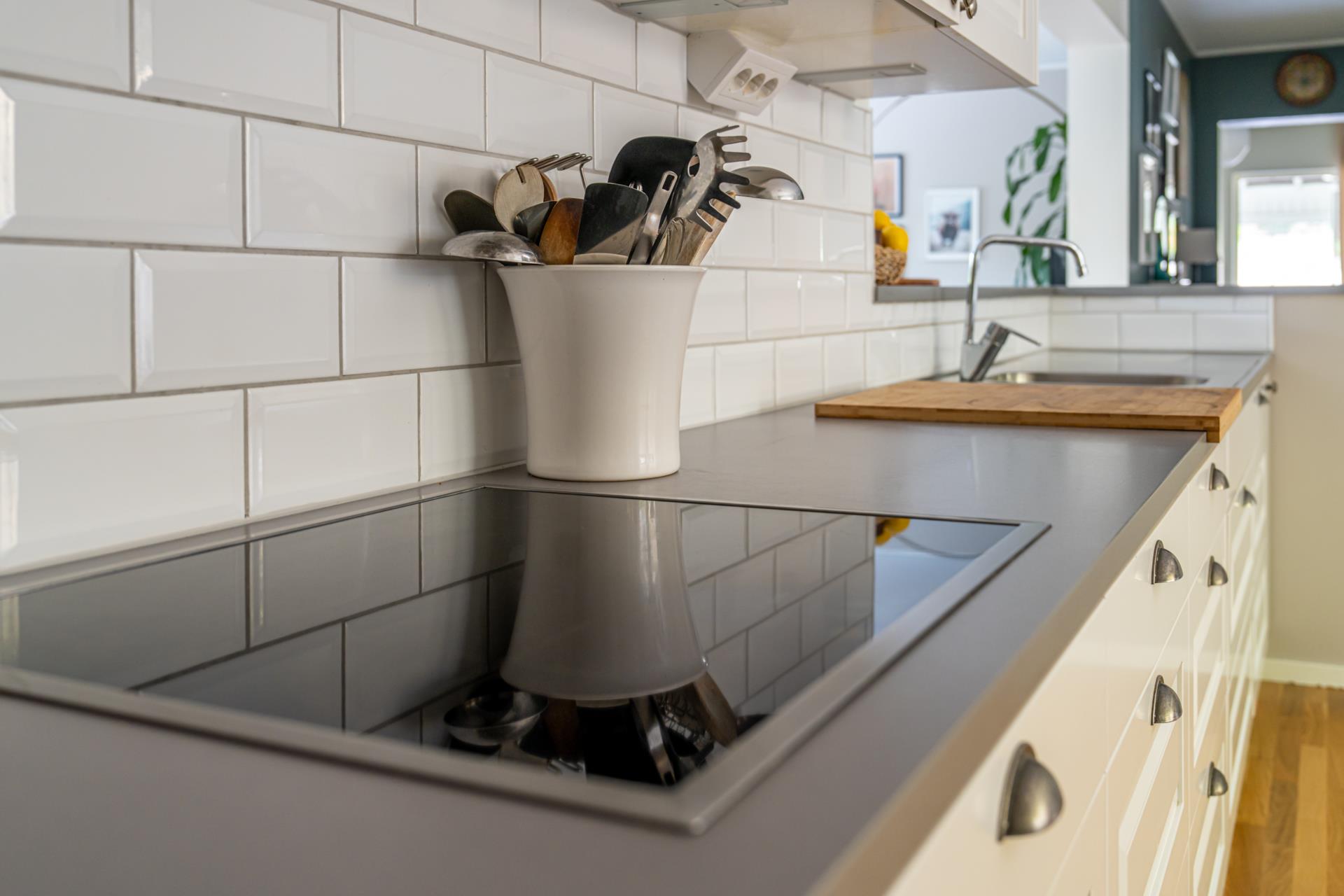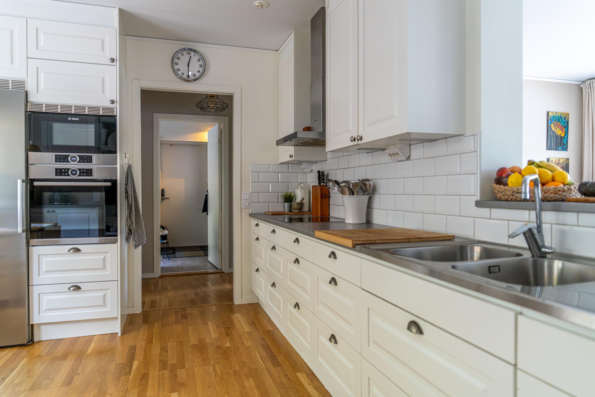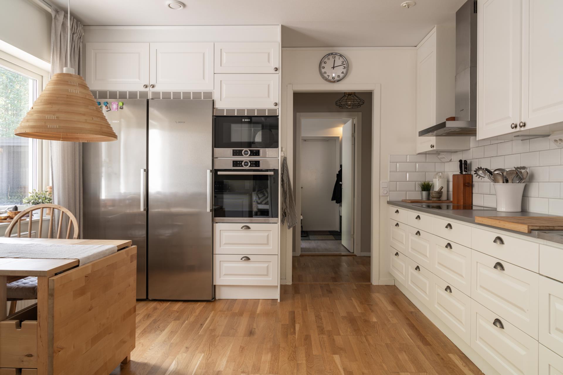 KÖK med parkettgolv, matplats och komplett maskinpark i rostfritt från Bosch. Kyl, frys, spishäll, spisfläkt, ugn, microvågsugn samt diskmaskin.