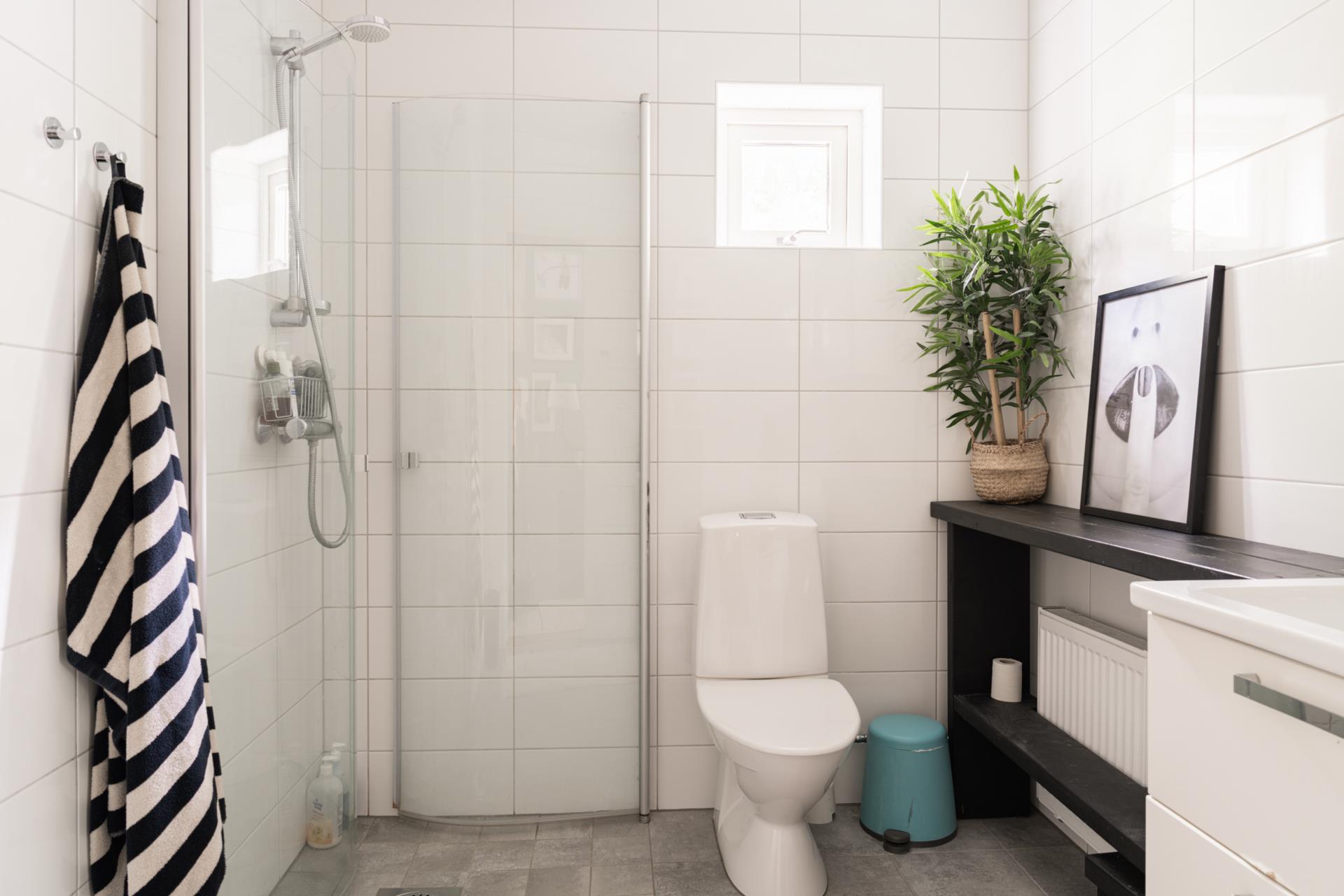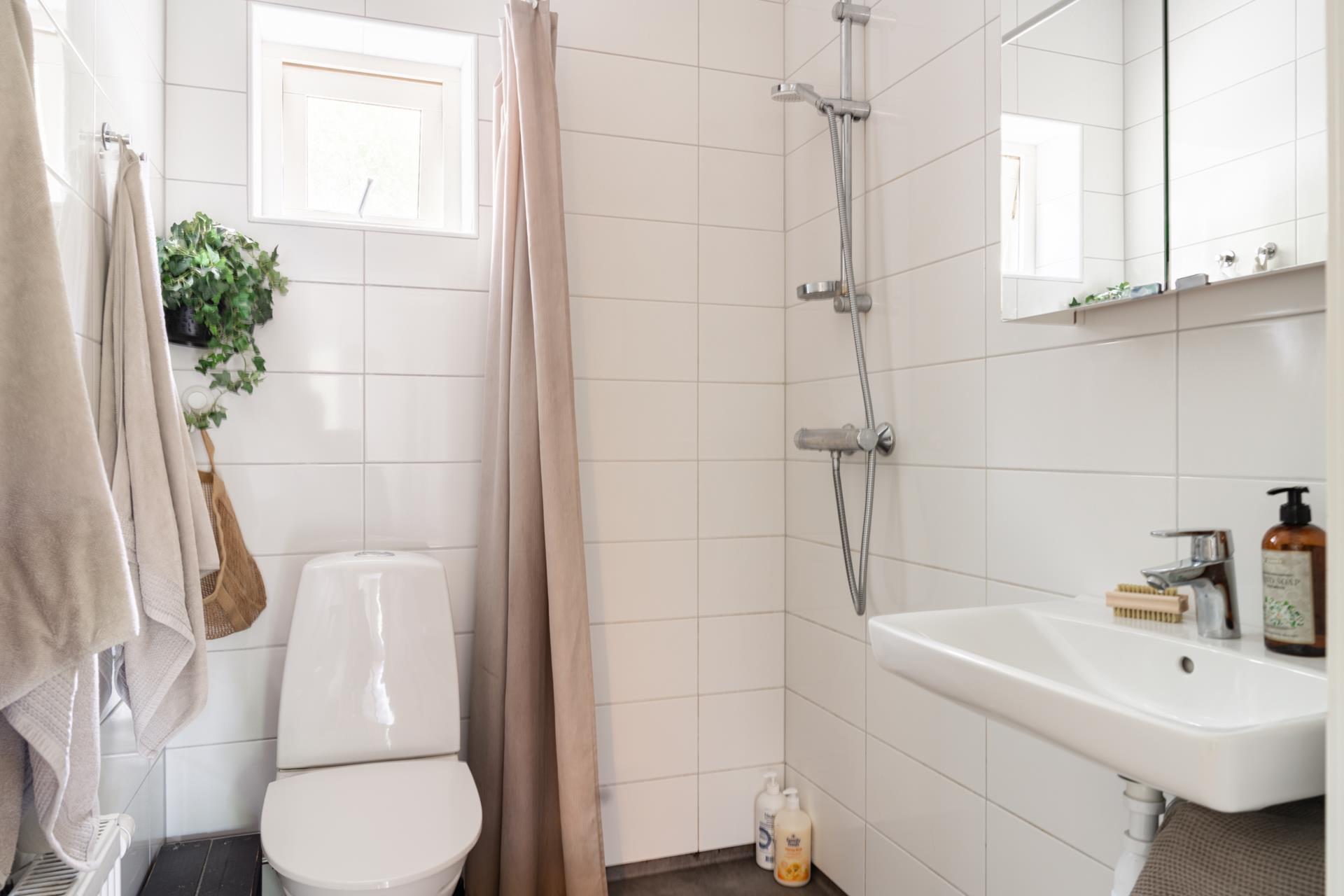 Helkaklat BADRUM med duschplats, wc, tvättställ, fönster och golvvärme.