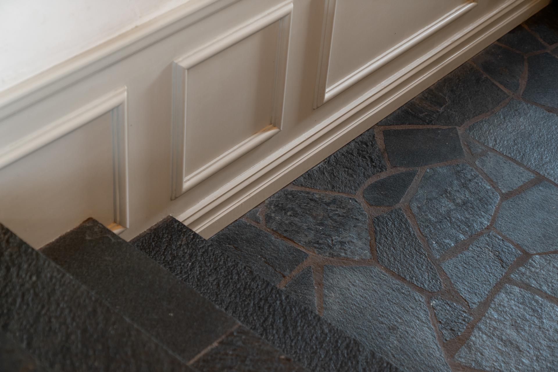 HALL i två etage med några trappsteg upp till den övre delen. Skiffergolv såväl i nedre delen som den övre.