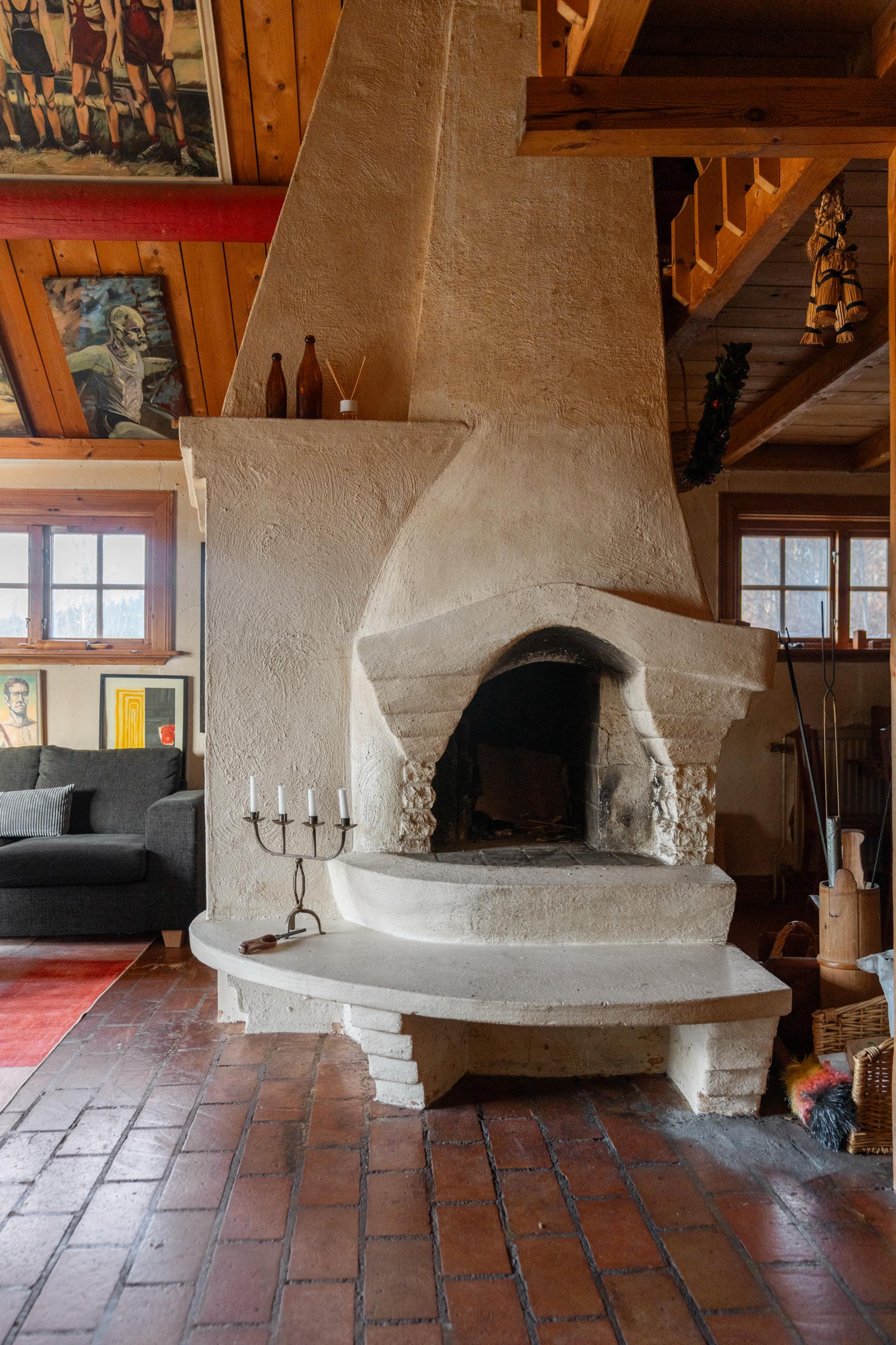 Pampigt VARDAGSRUM/ALLRUM/ATELJÉ med vackert tegelgolv, Tak upp i nock med synliga takbjälkar, en stor öppen spis med även vedspis i murstocken och dessutom ett loft över del av rummet.