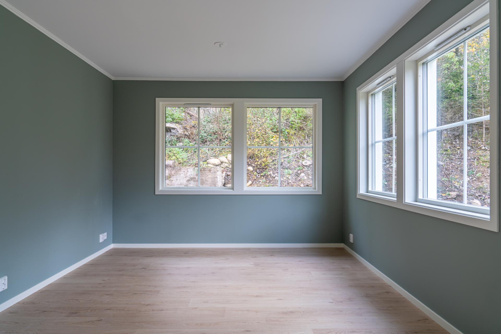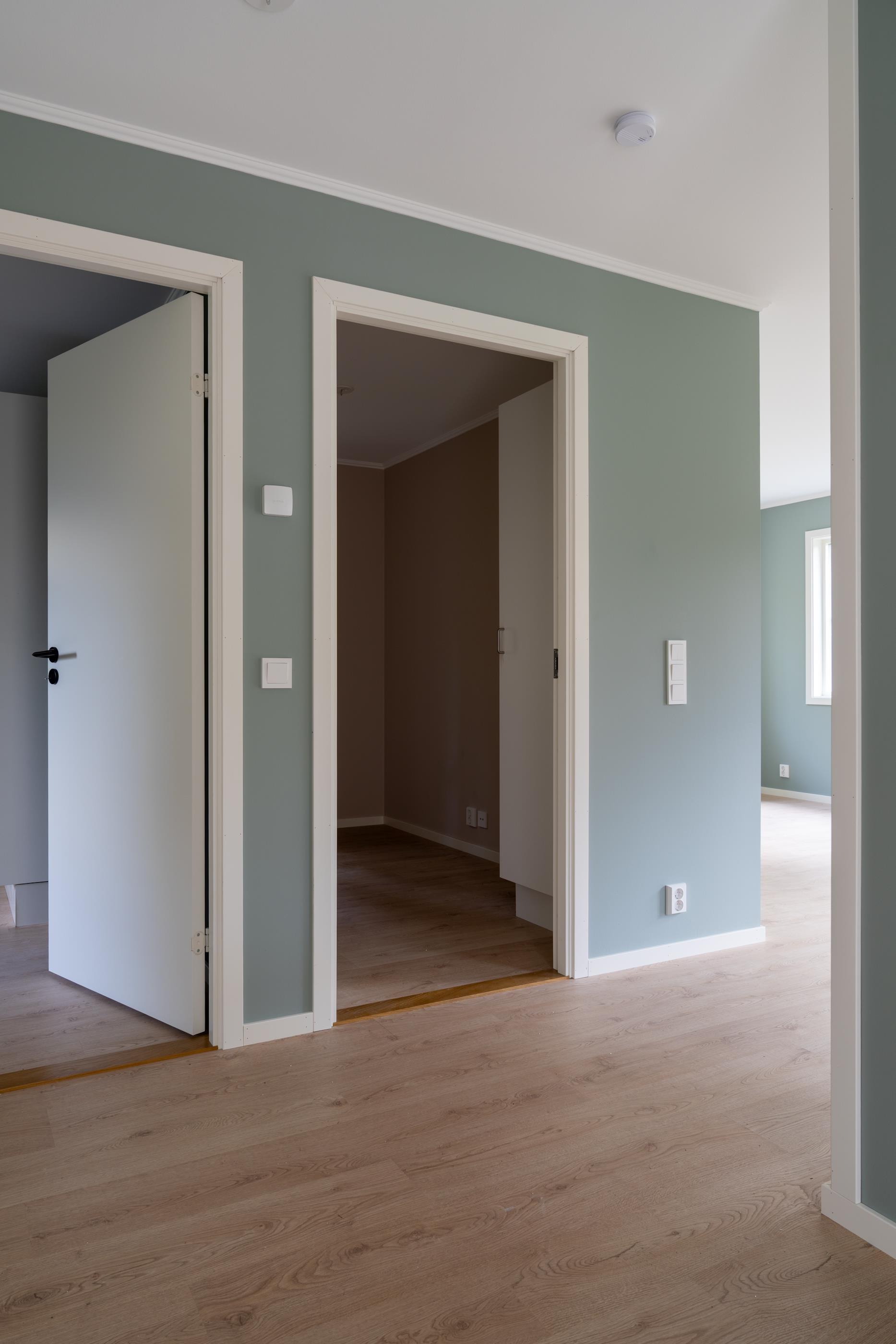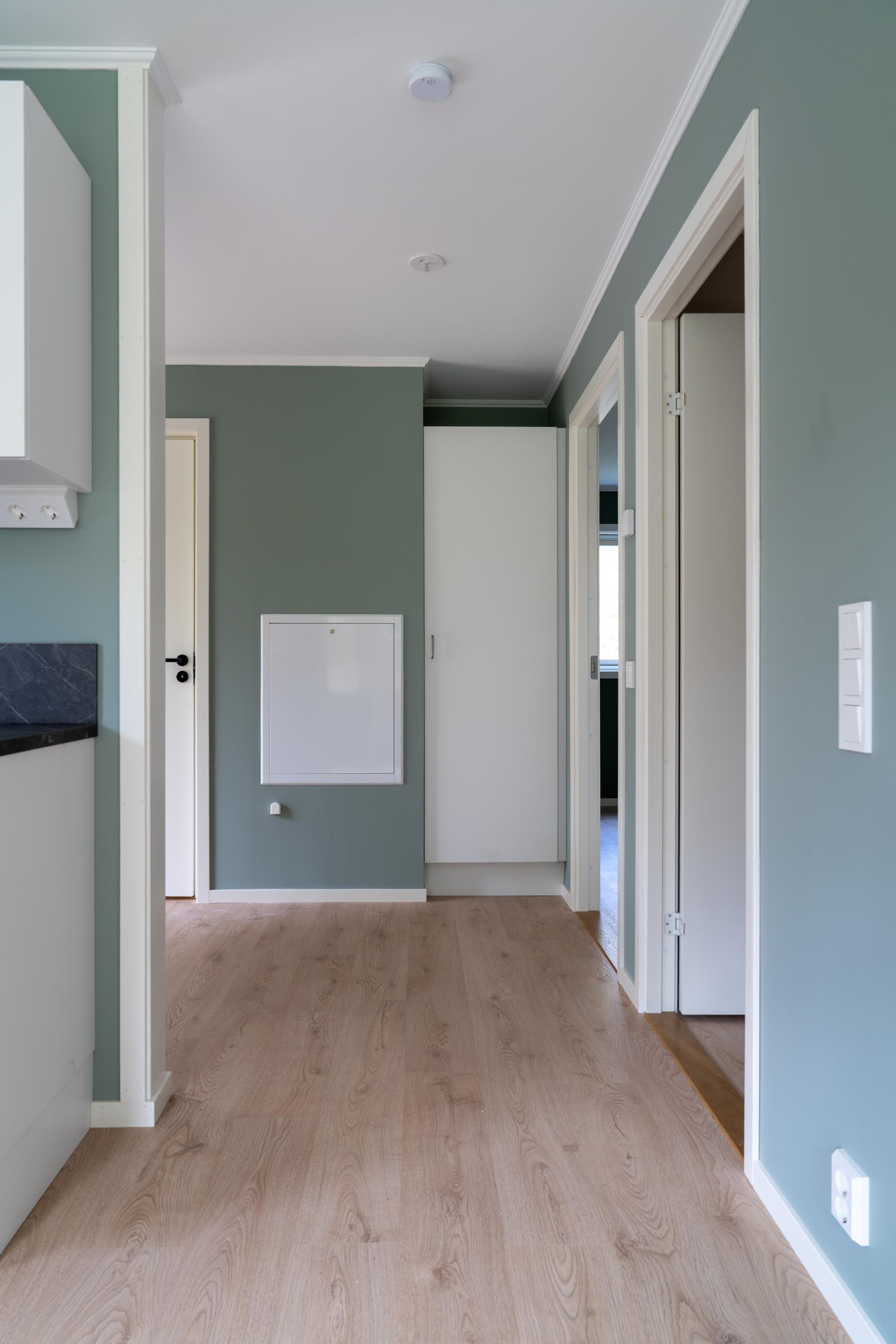 Bostaden är välplanerad och erbjuder ett stort och luftigt sovrum, ett mindre rum som passar utmärkt som kontor eller gästrum, samt ett trivsamt vardagsrum i öppen planlösning mot köket. De många fönstren skapar ett härligt ljusinsläpp och en fin kontakt med naturen utanför. Från kök och vardagsrum finns utgång till en framtida altan. Det rymliga badrummet är smakfullt utformat och utrustat med golvvärme för extra komfort.