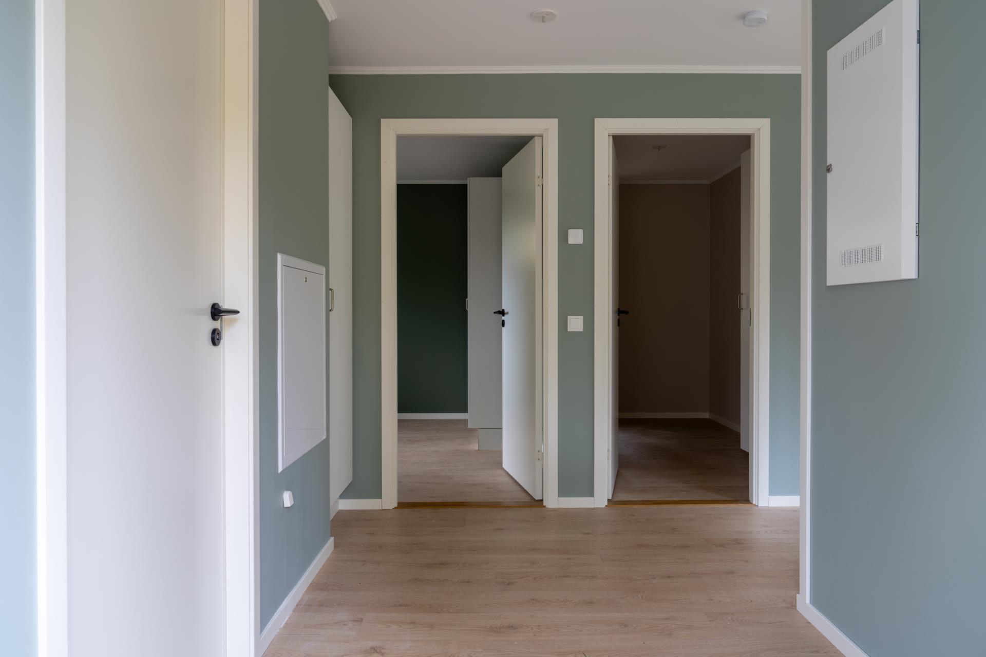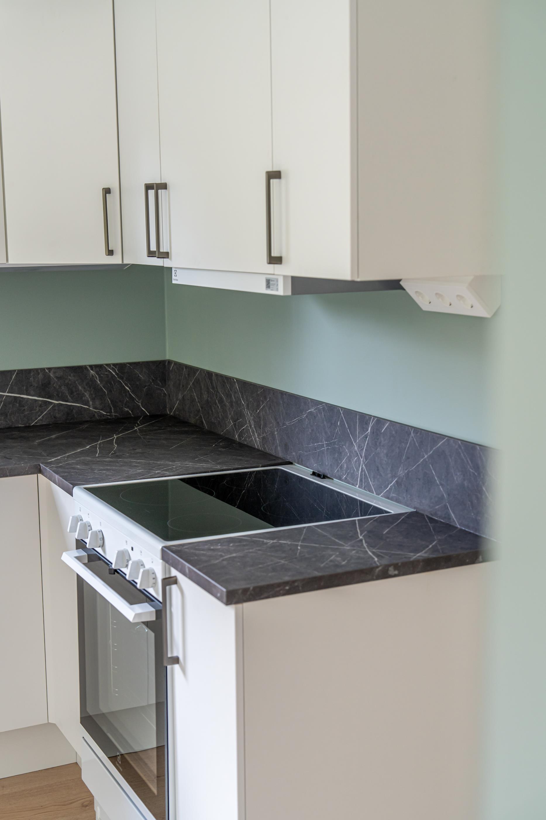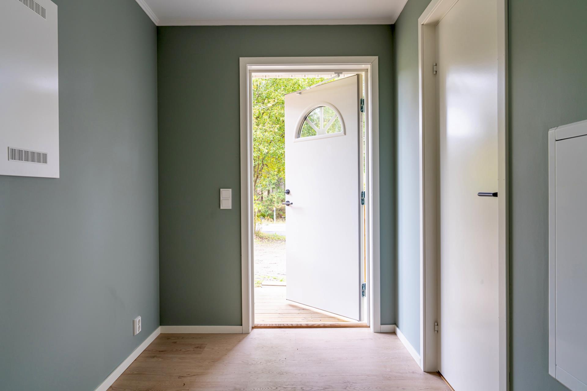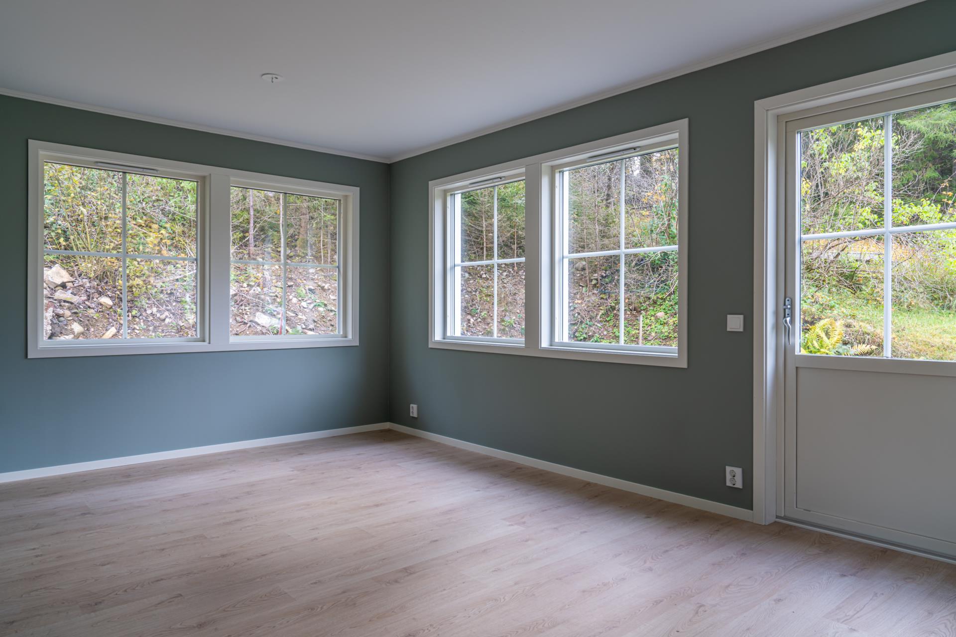 Bostaden är välplanerad och erbjuder ett stort och luftigt sovrum, ett mindre rum som passar utmärkt som kontor eller gästrum, samt ett trivsamt vardagsrum i öppen planlösning mot köket. De många fönstren skapar ett härligt ljusinsläpp och en fin kontakt med naturen utanför. Från kök och vardagsrum finns utgång till en framtida altan. Det rymliga badrummet är smakfullt utformat och utrustat med golvvärme för extra komfort.