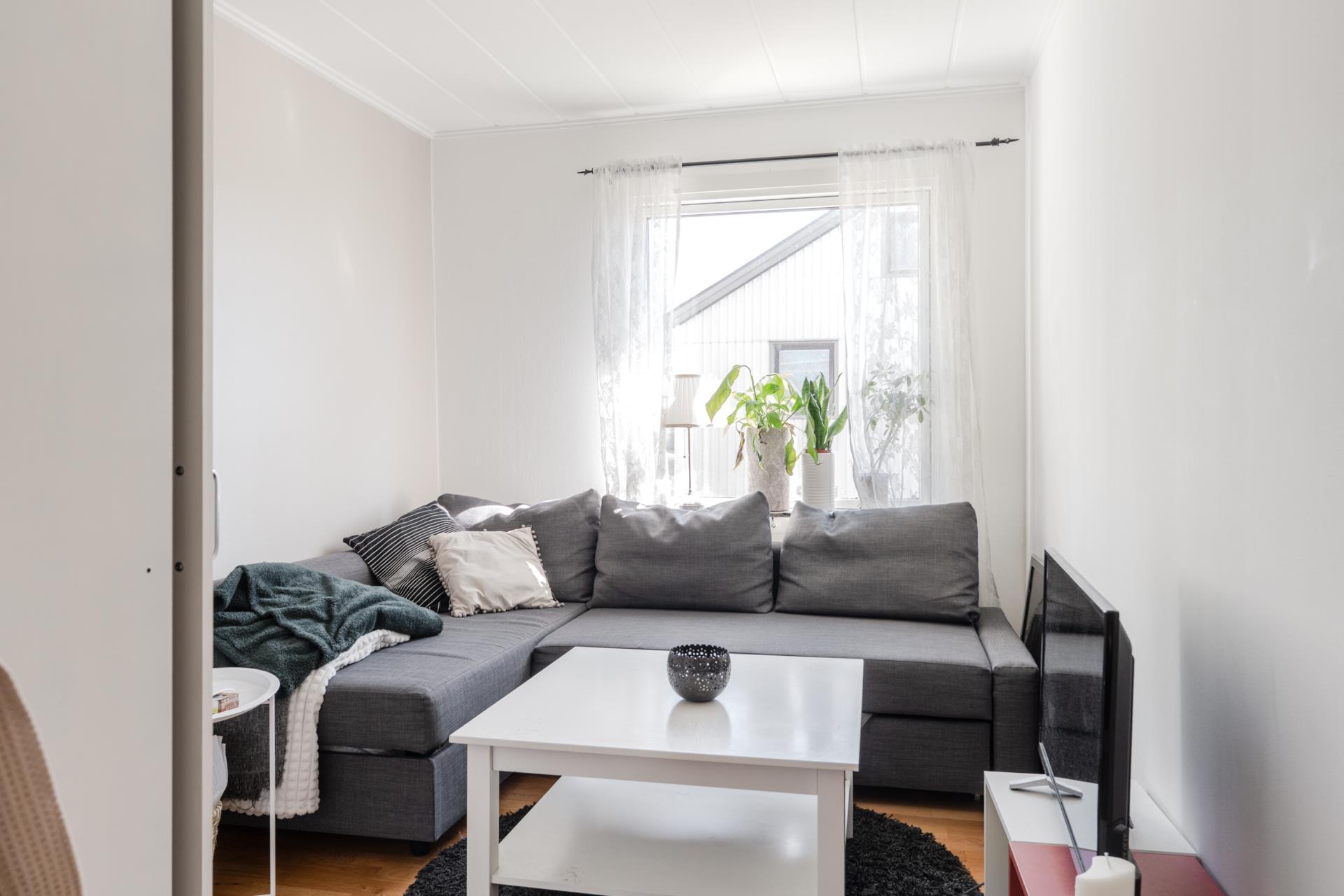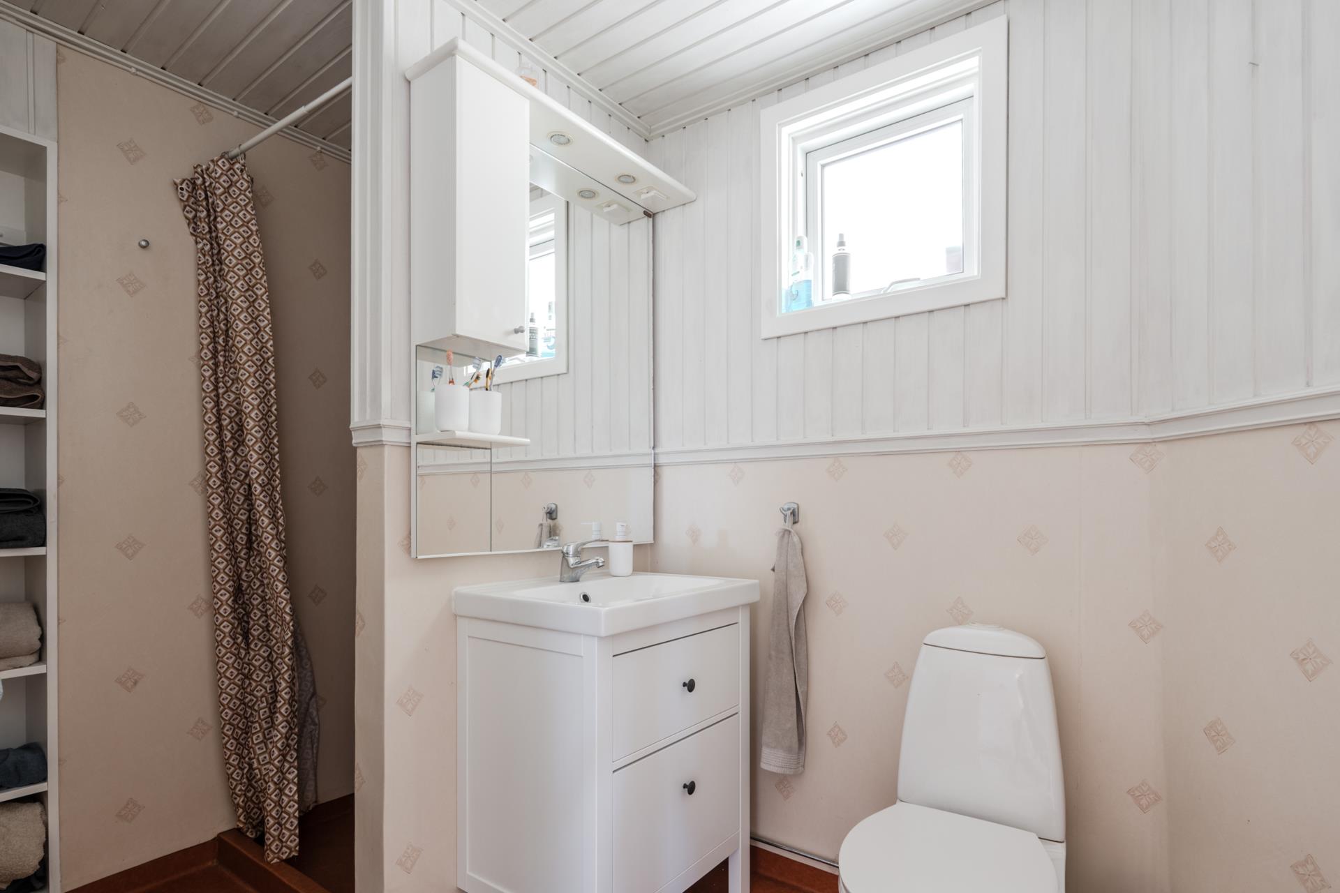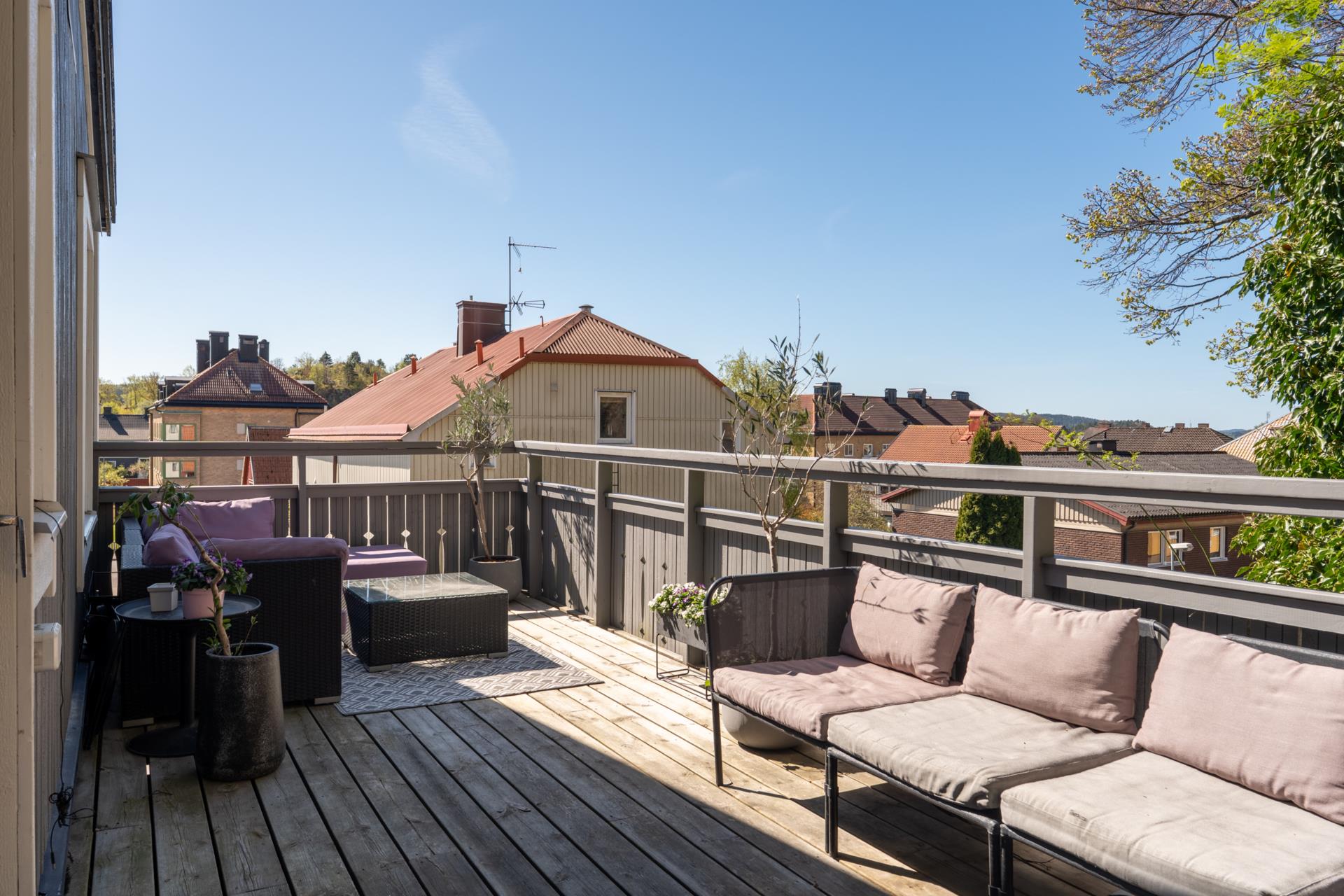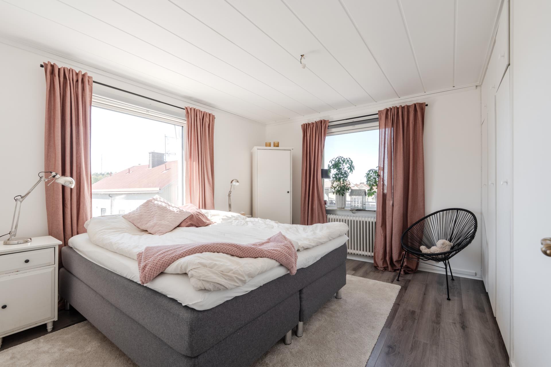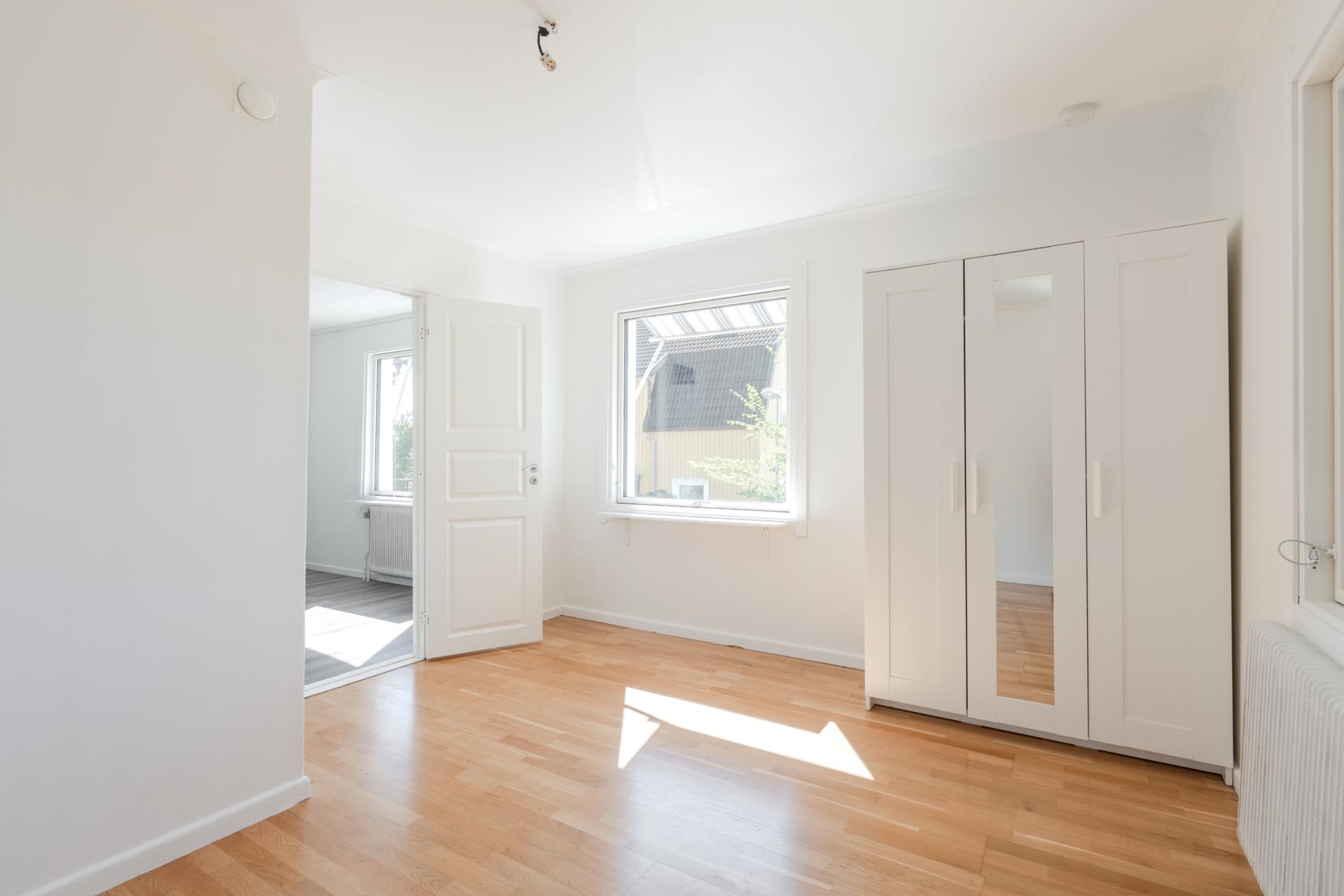 Lägenheten på övervåningen rymmer tre sovrum, vardagsrum, kök samt badrum med dusch. Från köket nås dessutom en härlig altan med fin utsikt – en naturlig plats för avkoppling.