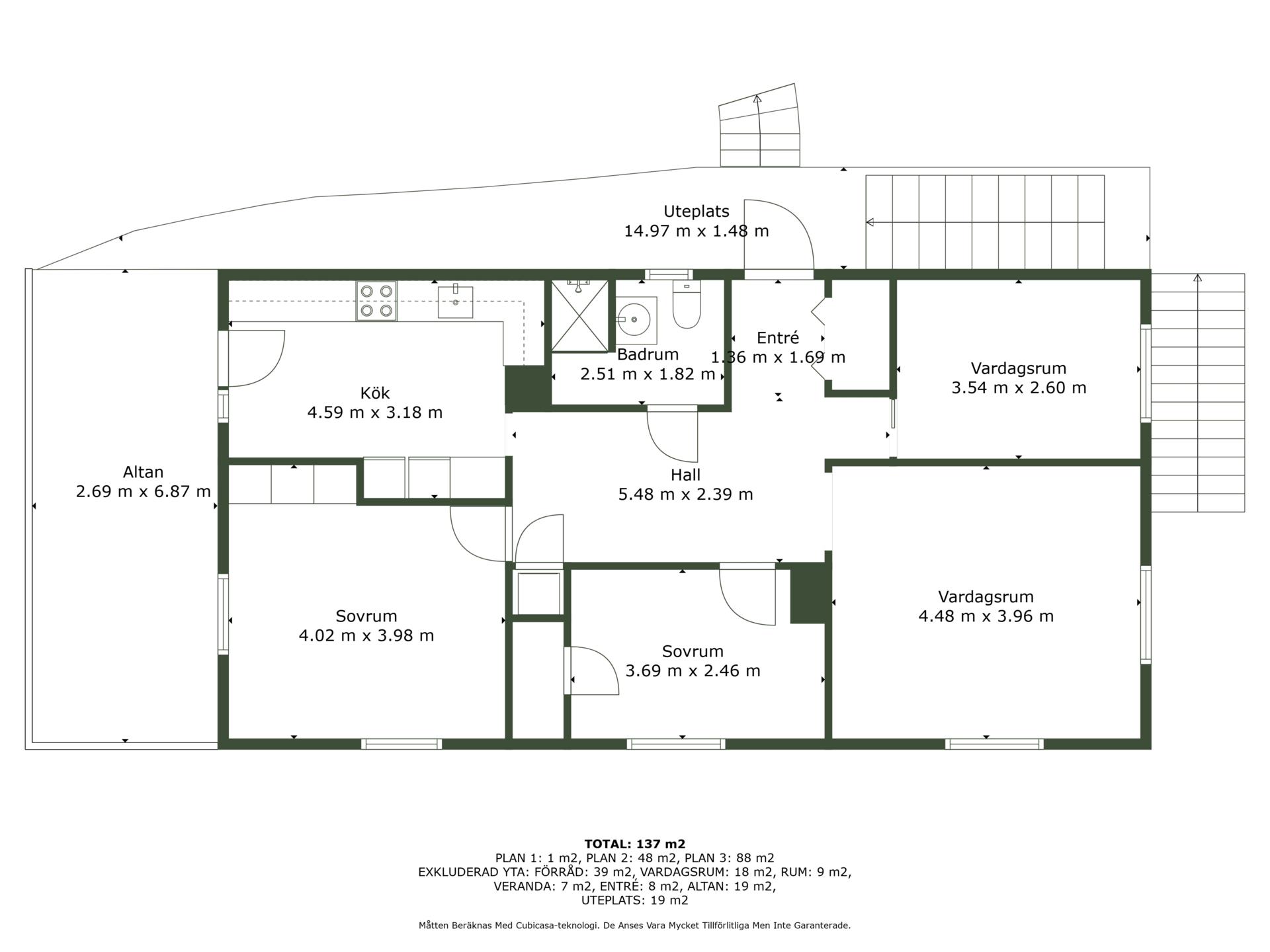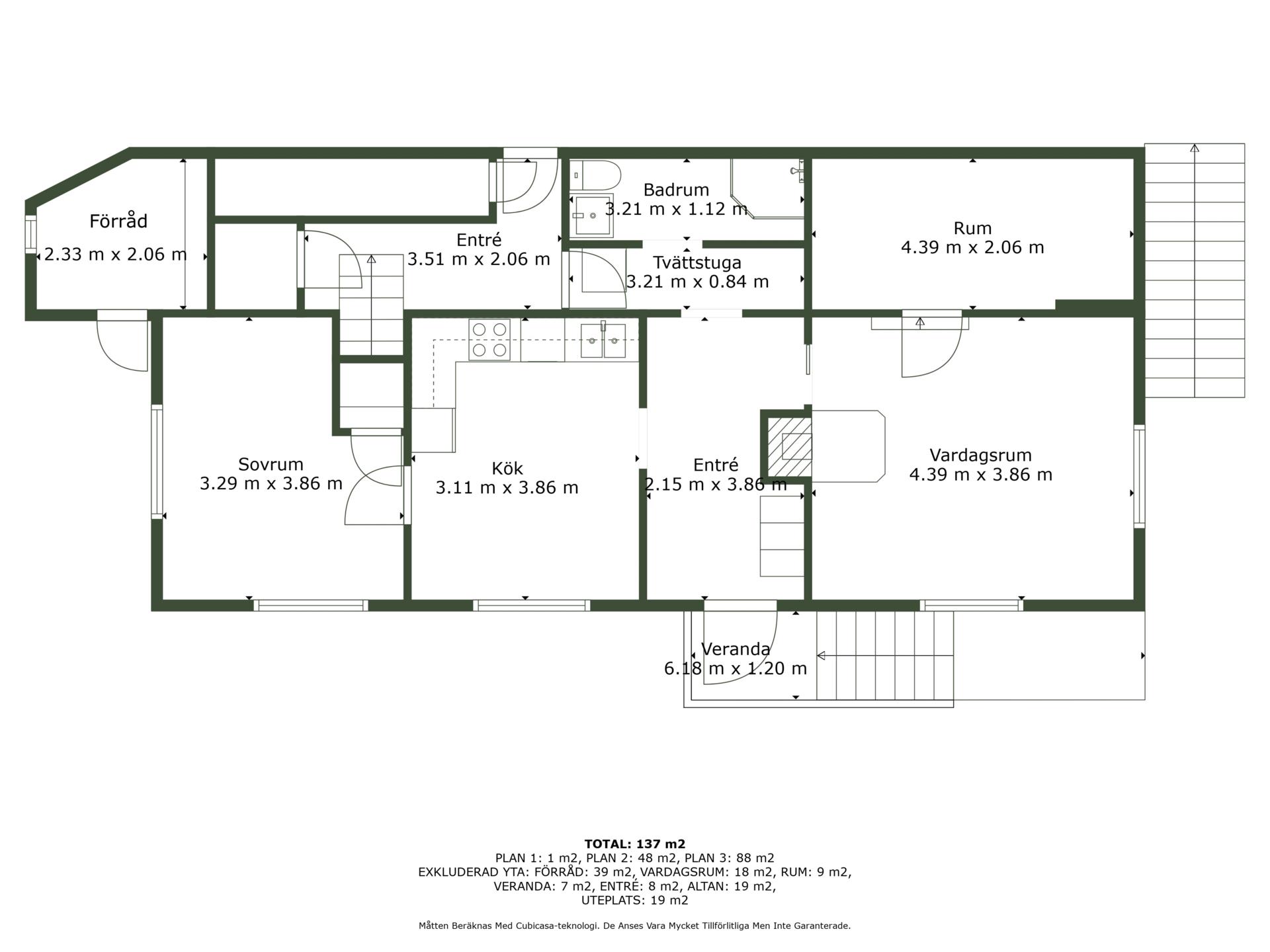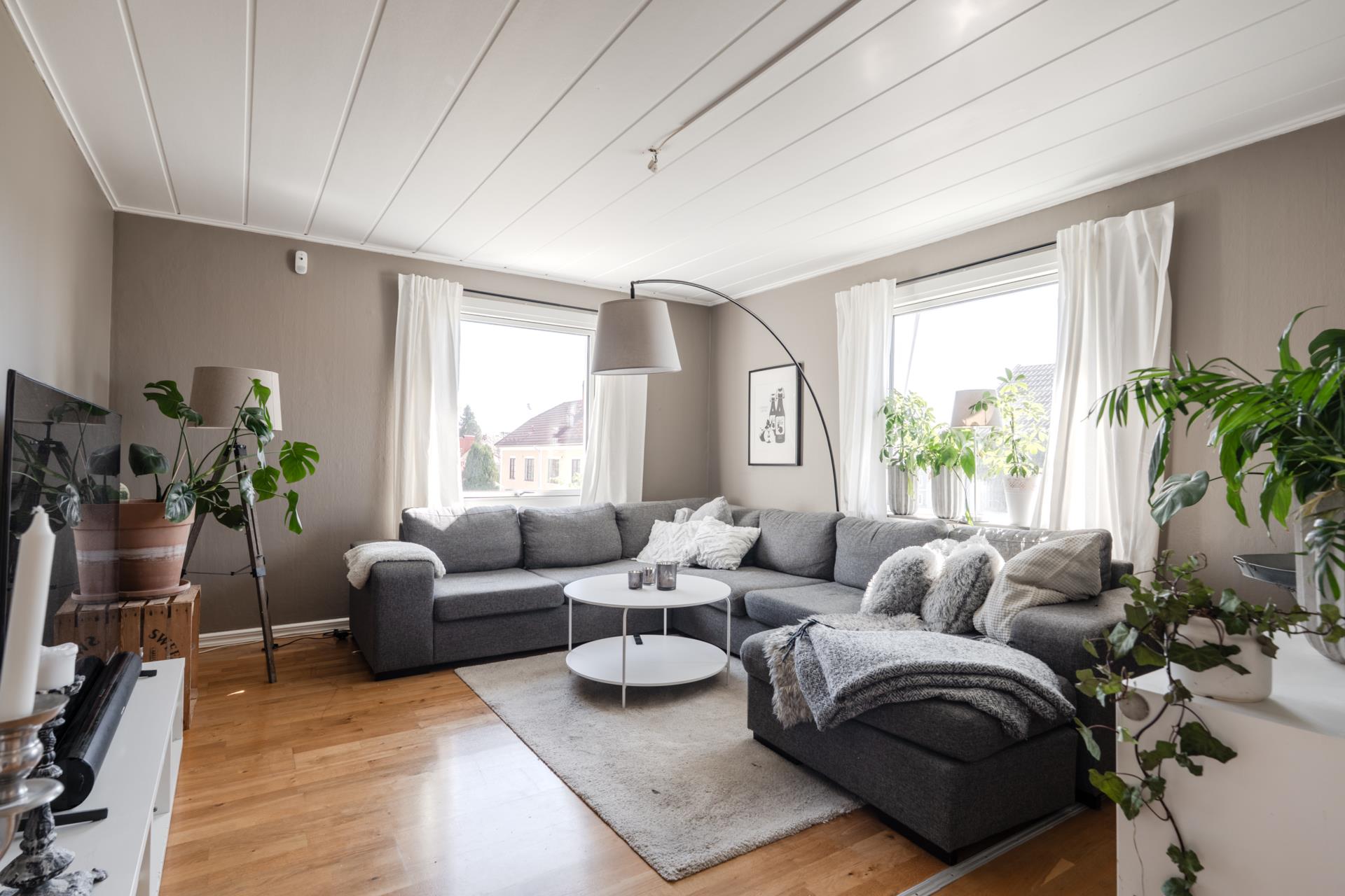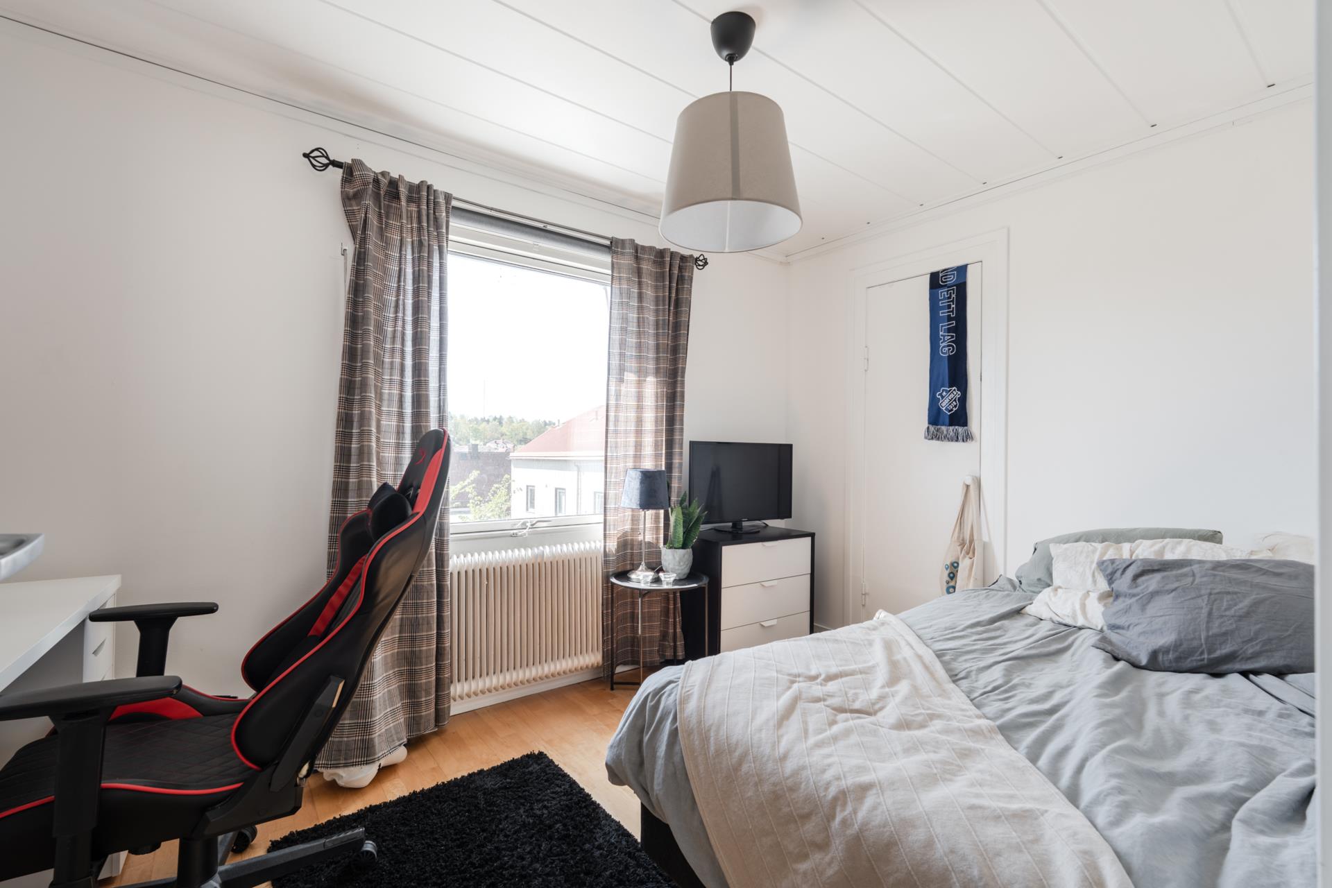 Lägenheten på övervåningen rymmer tre sovrum, vardagsrum, kök samt badrum med dusch. Från köket nås dessutom en härlig altan med fin utsikt – en naturlig plats för avkoppling.