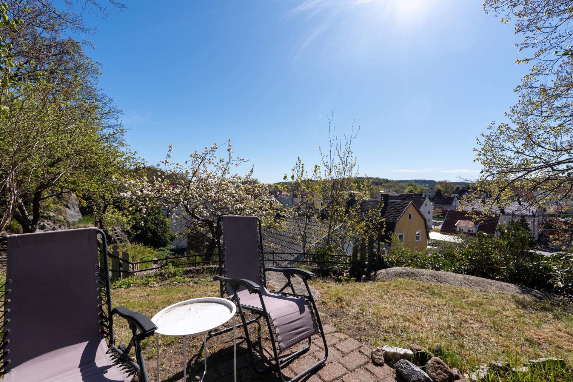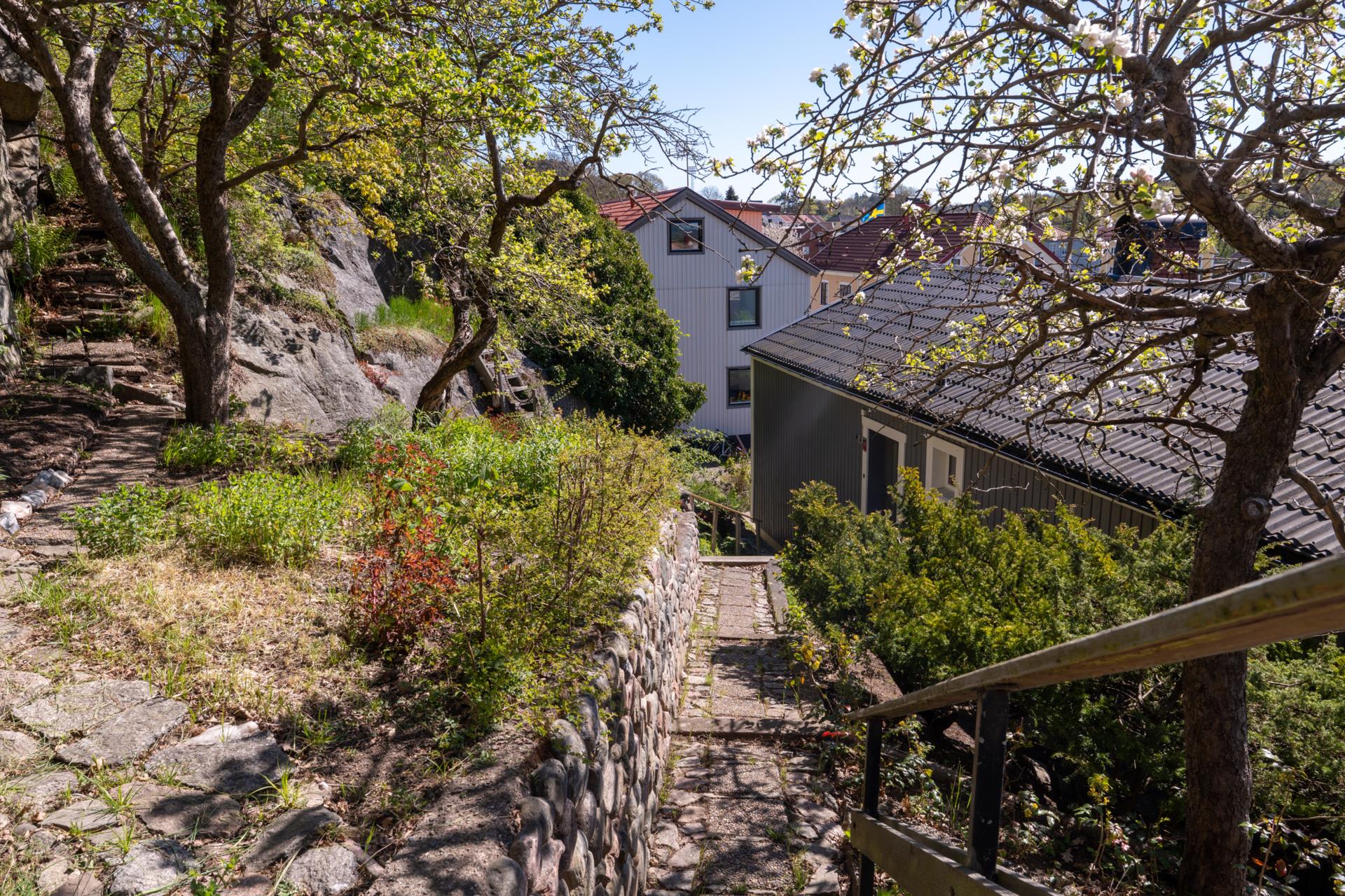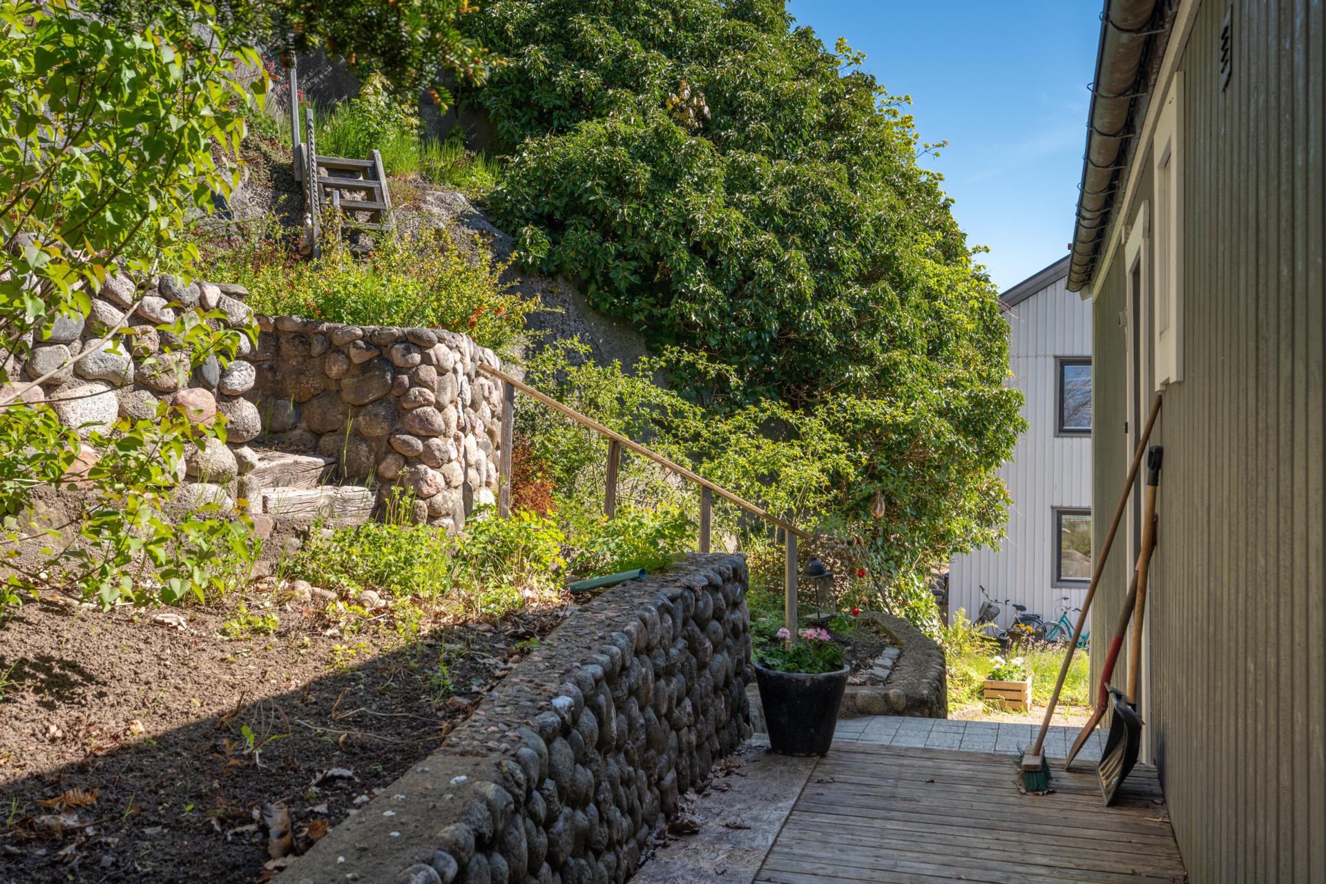 Huset ligger på en vacker sluttningstomt med dekorativa stenmurar, lummig grönska och flera uteplatser i olika väderstreck – här kan du följa solen hela dagen och njuta av både utsikten och lugnet.
