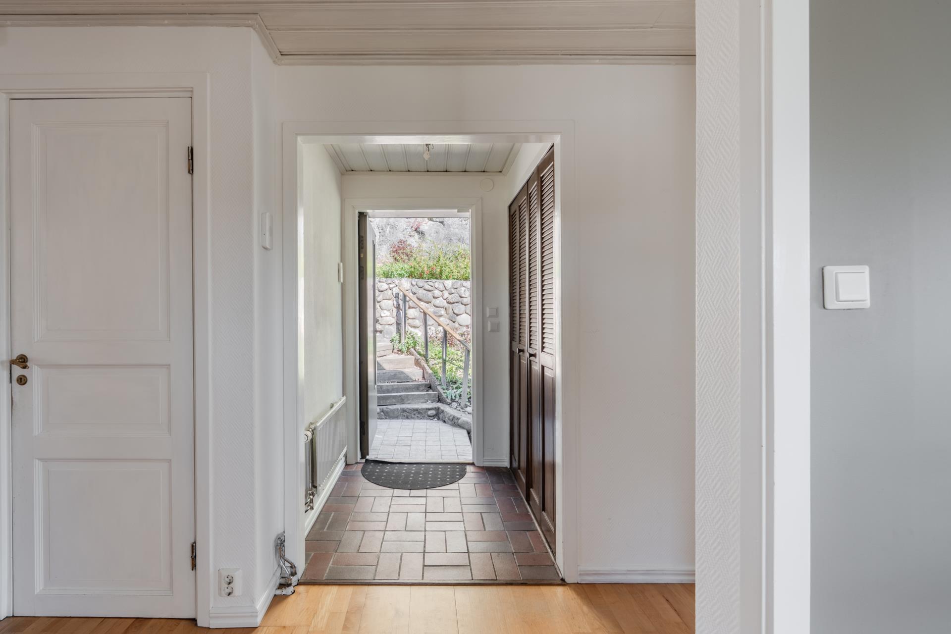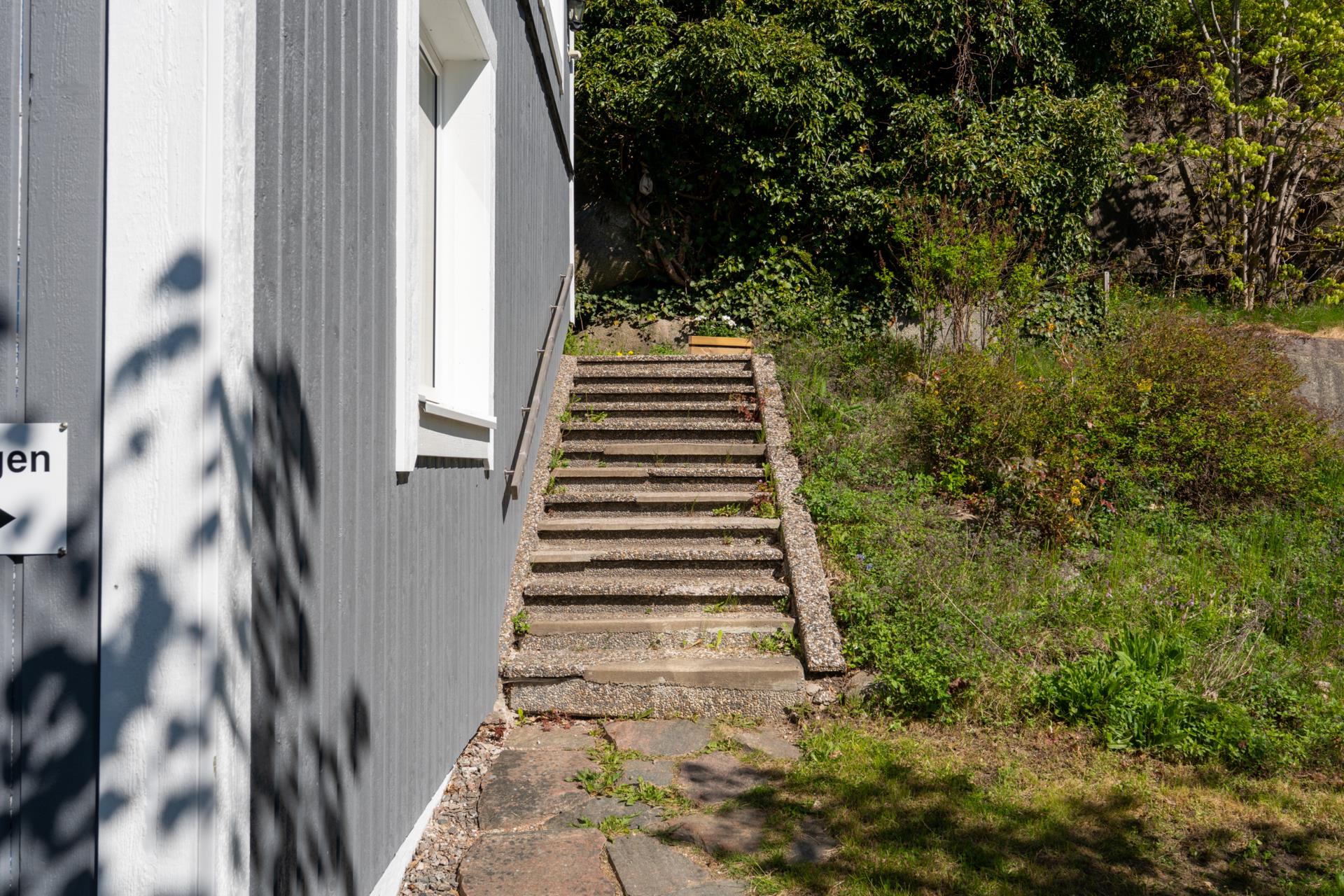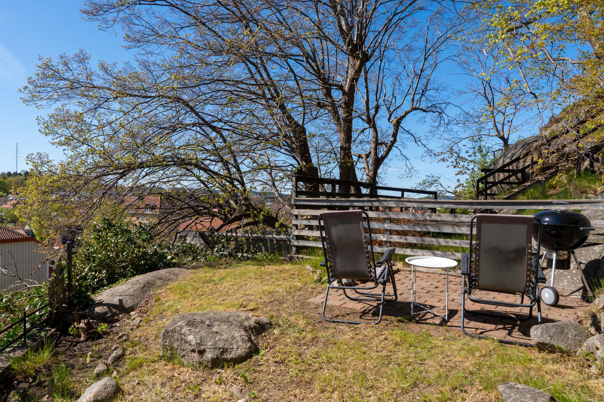 Huset ligger på en vacker sluttningstomt med dekorativa stenmurar, lummig grönska och flera uteplatser i olika väderstreck – här kan du följa solen hela dagen och njuta av både utsikten och lugnet.