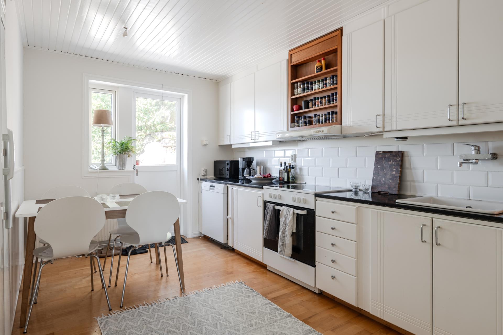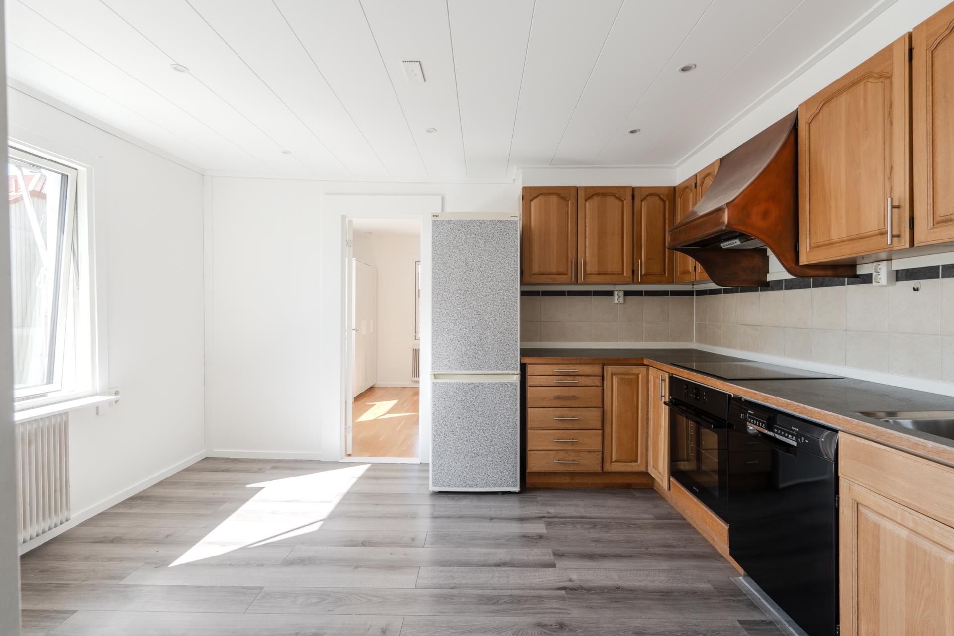 Den andra lägenheten är smart planerad med tre rum och kök samt ett helkaklat badrum. Här finns även en stämningsfull kamin som skapar både värme och trivsel under årets kallare månader. Lägenheten är perfekt som uthyrningsdel och ger möjlighet till extra inkomst.
