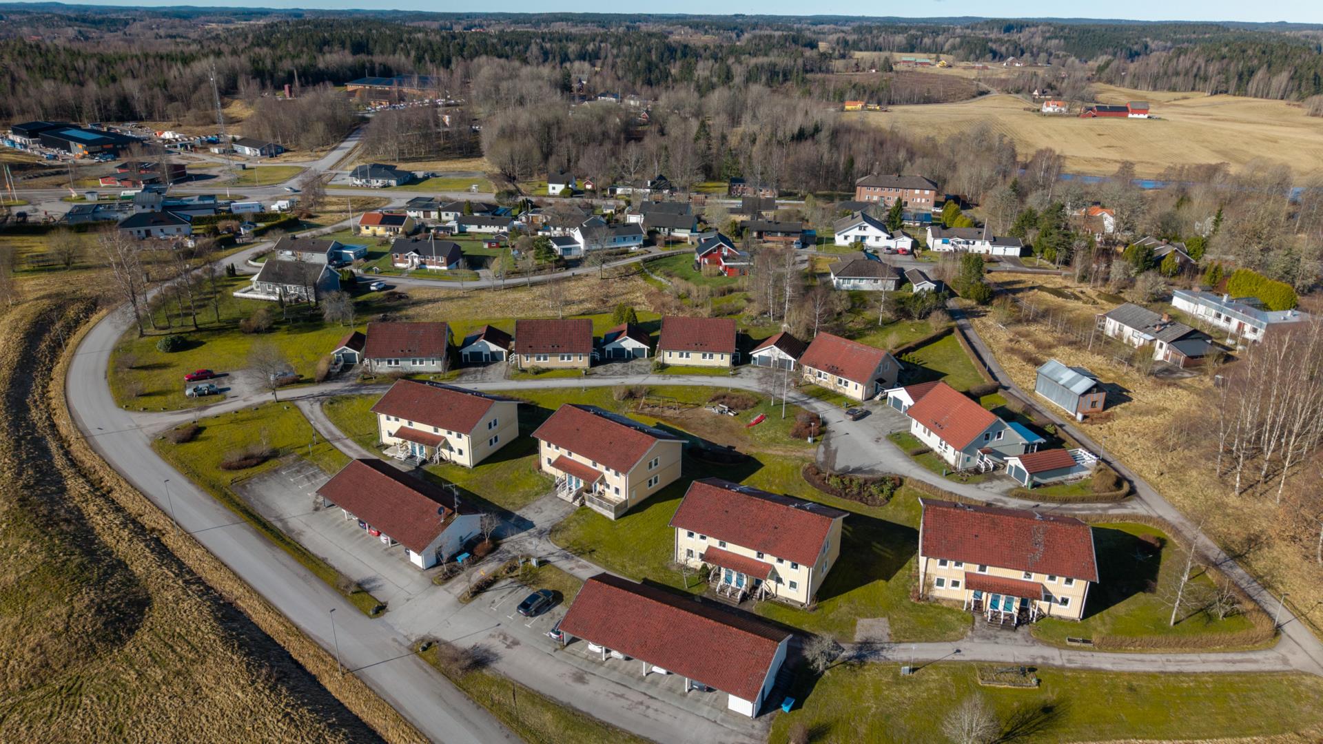 Till huset hör ett eget garage och en asfalterad uppfart som gör parkeringen enkel och bekväm. På baksidan finns en veranda och en insynsskyddad uteplats, en härlig plats för avkoppling, grillkvällar och sköna sommardagar i privat miljö.